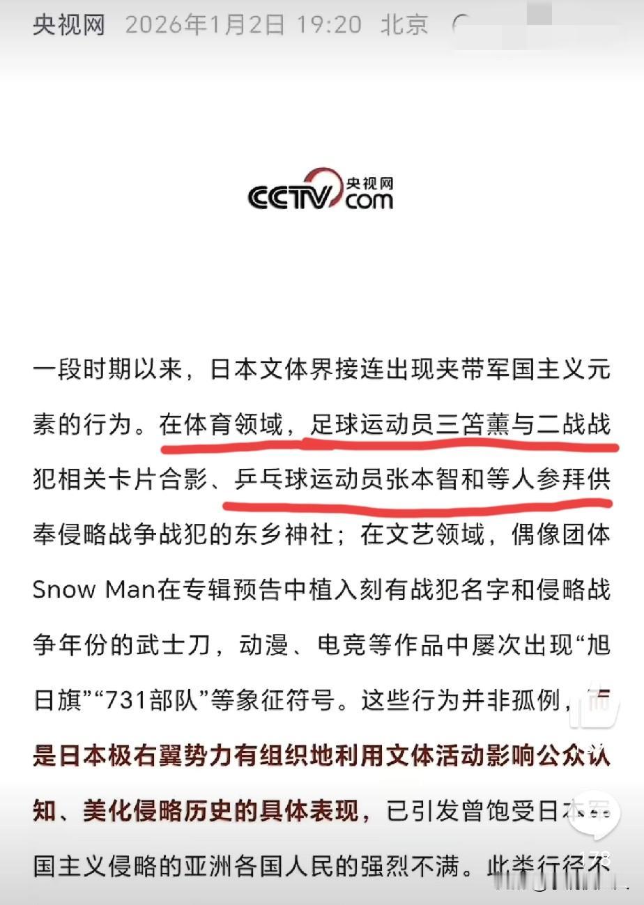 张本智和的真面目,终于被央视揭开了! 央视重点点名,日本足球运动员三笘薰和乒乓球运动员张本智和在列。 张本智和身为一个运动员,却借着运动员的影响力“夹带私货”,在巴黎奥运会比赛前,公然参拜靖国神社。 除了这以外,他还在香港wtt总决赛期间,面对媒体采访,公然使用高市早苗错误言论,这就是赤裸裸的表达对高市早苗的支持。 张本智和,辜负了中国球迷对他的支持,在中国打球时表现的滴水不漏,在背后却干着这样的事,他的本来面目终于被曝光了。 央视网的这次点名,张本智和以后在中国的比赛基本凉凉了。 这样的后果,都是他咎由自取,早就该点点他了!