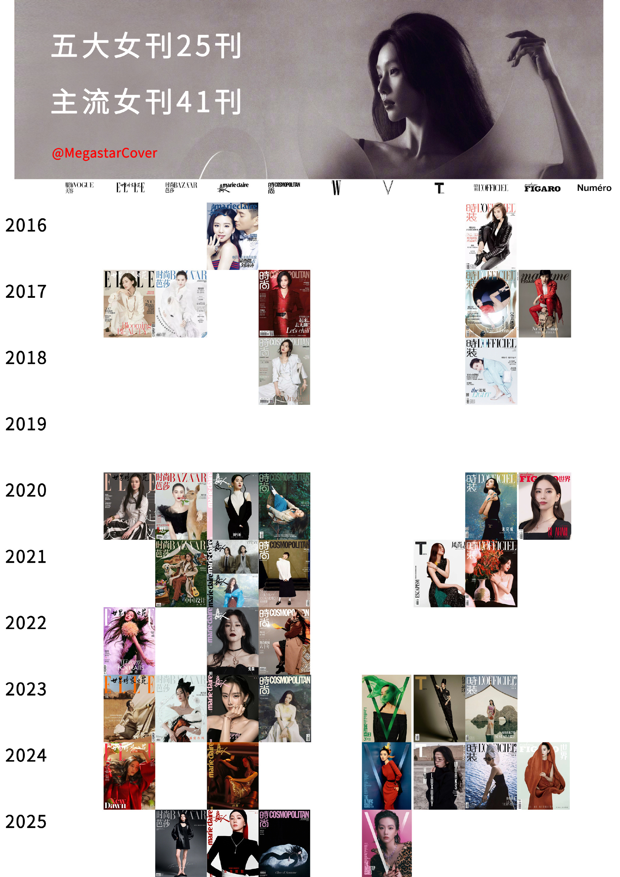 华人女星(大花➕85花➕90花)内地主流女刊刊数排行榜,其中刘诗诗五大女刊25刊,主流女刊41刊