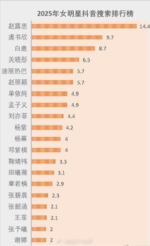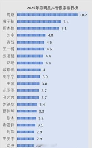 2025男女明星🫘搜索排行榜单🈶:男明星top5:鹿晗、黄子韬、周杰伦、刘宇、肖战;女明星top5:赵露思、虞书欣、白鹿、关晓彤、迪丽热巴。