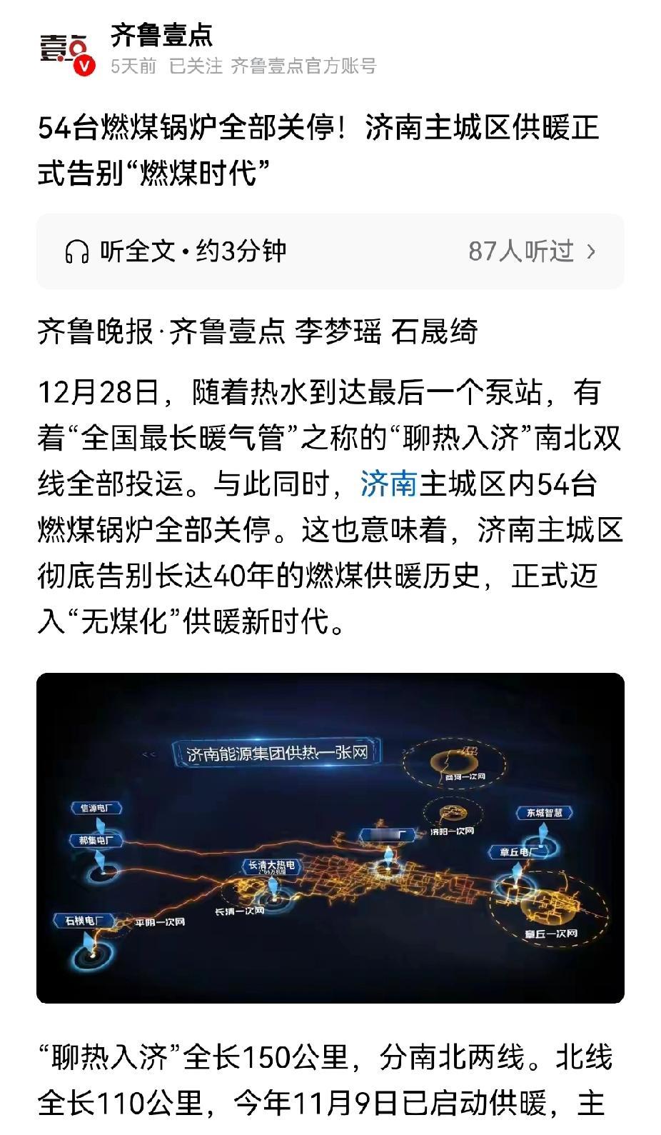 济南热力的大手笔:54台燃煤锅炉关闭,济南主城区告别燃煤时代,“大烟筒”相继拔除。 济南被称为“大县城”,有一部分和主城区内星罗棋布的大烟筒摆脱不了关系。别的不说,以前大明湖往北望去就有一个大烟筒。 这个大明湖北边的大烟筒就是明湖热电厂。之前济南规划可以用触目惊心来形容,有的单位甚至能随便在济南景区旁边乱盖,比如济南历下法院盖的东湖大厦,就严重破坏了大明湖东南天际线;再比如齐鲁宾馆在千佛山脚下盖了一栋楼一直没用上的楼;再比如泉城广场旁边的楼不知道压住了多少泉水。 明湖热电厂就是当年为了解决省级机关和家属院供暖问题盖的,这个热电厂就在大明湖北边,特别煞风景。 不光明湖热电厂,在那个年代,为了供暖,济南建了不少小锅炉,这些小锅炉不光污染着空气,也损害着市容。 没想到,这个问题竟然是济南热力解决的,而且还是大手笔解决。 首先找到替代热源,毕竟还得供暖啊。其次将暖气引入济南,于是诞生了石热入济和聊热入济工程,聊热入济是全国最长的供暖输送管道。两条管道用的是电厂余热,可以解决1.3亿平方米供热问题。 再加上新建的长清热电厂、章丘热电厂和之前的黄台电厂,基本实现了济南全域一张网供暖,完全淘汰了燃煤锅炉,一批主城区大烟筒也相继拆除。 可以说,济南热力这一方面做的挺好的。