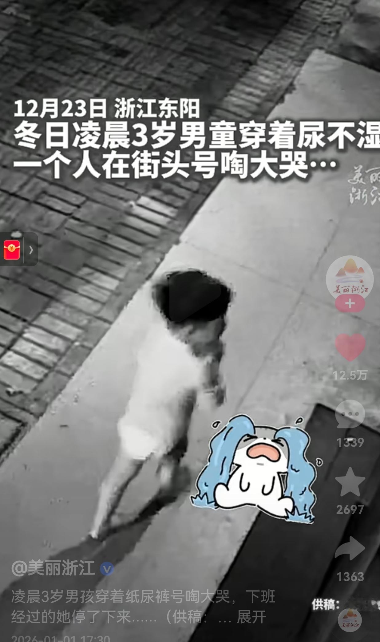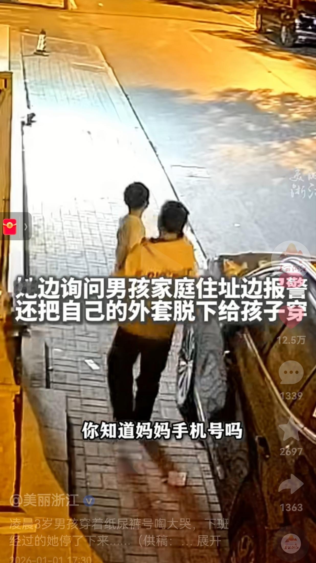 看得心都被揪起来了!冬日凌晨一位3岁男童,穿着尿不湿,一个人在街上嚎啕大哭,幸好遇到了善良的赵女士,安抚孩子的情绪将外套给孩子披上,最后,报警求助。终于帮孩子找到了妈妈。网友:一件外套、一次报警、一路守护,这些小事凑在一起,就是最暖的人间烟火气! 12月23日,浙江东阳,大冬天的凌晨,当时天气特别寒冷,一个3岁男娃就了穿件T恤、套着尿不湿,光溜溜的腿踩在冰凉的路上,扯着嗓子大哭,那小小的身子在街上晃来晃去,看着就让人心疼。 你说好巧不巧,刚下班的赵女士骑着电动车路过,听到了孩子的哭泣声,转头一看就看到了孩子,她没有选择视而不见,而是立马刹住车冲过去把孩子抱起来。 赵女士温柔地对孩子说:“娃咋了呀?,怎么一个人在这里呢?你知道妈妈电话不?” 可是,由于孩子太小,啥也说不上来。她赶紧掏出手机报警,还把自己的外套脱下来,仔仔细细给冻得直哆嗦的孩子披上,轻声细语地说:“阿姨抱你上车哈。” 没一会儿,又有两个好心人停下脚步,蹲在孩子旁边逗他、跟他说话,有人递水有人挡着风,几个人围着孩子守着,直到民警赶过来。 民警到了之后,赵女士把孩子小心地抱上了警车,这才放心地转身离开。 民警紧接着联系孩子家人,才知道娃是趁大人没留意,穿着尿不湿偷偷跑出来迷了路。 孩子妈妈发现娃不见后,早就急得团团转,满大街找,嘴里不停念叨:“妈妈到处找你呢?你咋能乱跑啊”。 最后孩子平平安安回到了妈妈的身边。 网友看到后评论说:“当妈的看不得这个,孩子哭着喊妈妈的样子太心疼了,还好有这么多好心人,也提醒我以后看娃更要上心!” 还有的网友说:“凌晨下班还愿意停下脚步管这事,赵女士真的太善良了,还有那两个好心人,你们都是小天使!” 我们常说“人间自有真情在”,可是,真见着这样的场面,才真真切切感受到陌生人之间的善意有多暖。 赵女士和这两个好心人,不过是停个车、递件衣服、说几句软和话,都是看似微不足道的小事,但是却给了孩子最踏实的依靠。 当然了,这事也给所有家长提了个醒:小孩子没啥安全意识,也不会保护自己,当爸妈的可得把孩子看紧了。 家里的门窗得做好防护,平时要一遍遍教娃记爸妈的名字、电话和家住哪,也能给娃戴个带身份信息的手环、胸牌。 只有家长对孩子多上点心、多一份警惕,才能避免孩子走失,意外才不会发生。