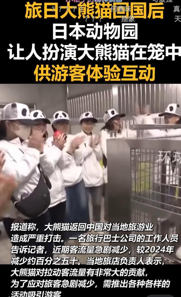 真人扮熊猫关笼,日本为吸客拼了。 为留客流,他们连 “山寨熊猫” 都搬出来了。 真熊猫走了,就自己造一个? 还搞成了付费项目,花 370 块就能体验当 “熊猫饲养员”。 而 “饲养” 的对象,竟是工作人员戴头套假扮的 —— 穿着黑白毛绒服蜷缩在特制竹笼里,还会配合做出啃竹笋、打滚蹭人的憨态动作。 公园出此下策,实属无奈。 去年,4 只大熊猫租借到期返回中国,当地旅游业遭受重创。客流量比熊猫在时锐减了大约 50%,周边的熊猫主题商店、餐厅更是门可罗雀,部分店铺直接关停。 这略显荒诞的操作,无疑是在消耗大熊猫留下的情怀。 “花三百多喂个‘假熊猫’,更像一场滑稽的闹剧”,也有人表示 “孩子没见过真熊猫,倒也玩得开心”。 但这或许只是开始,后续,日本最后两只熊猫也将返回。届时,全国将进入 “零熊猫时代”。 失去了这个绝对的 “顶流 IP”。依赖熊猫经济的相关产业,必须绞尽脑汁求生。 这场靠情怀硬撑的自救,又能撑多久? 未来,可能还会有更多意想不到的“神操作”出现。