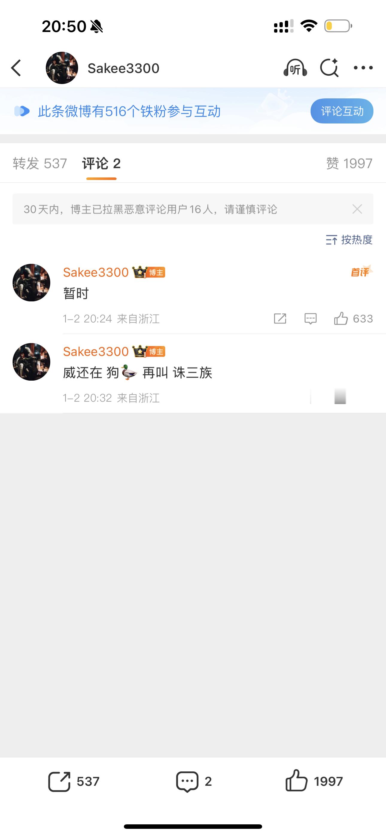 Sakee宣布自己删除微博后,对此补充说明:暂时!威还在 狗🦆 再叫 诛三族sakee