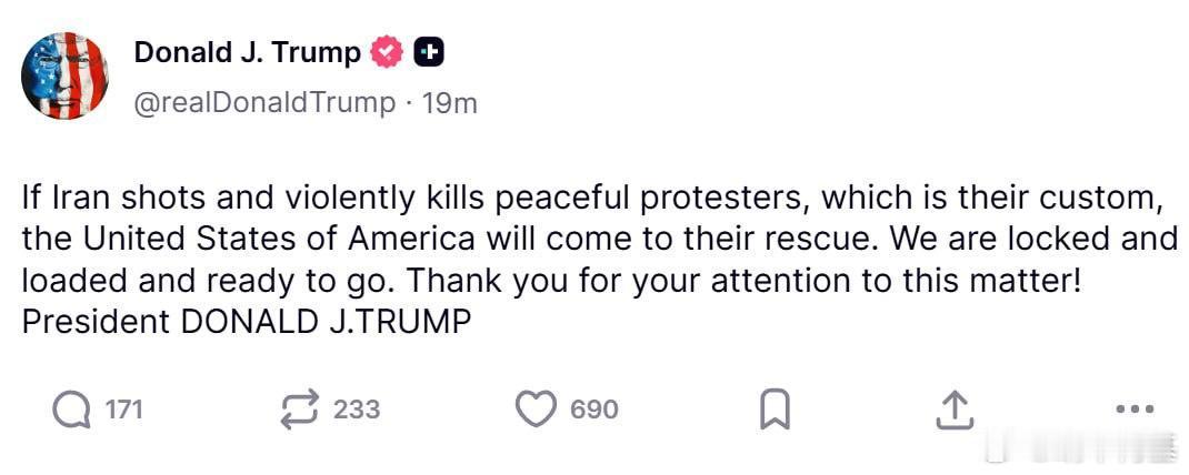 特朗普表示,如果伊朗要杀害和平示威者,美国将赶去救援,随时可以。来源:RealDonaldTrump伊朗下令直接打击以色列伊以冲突最新进展汇总美国空袭伊朗核设施