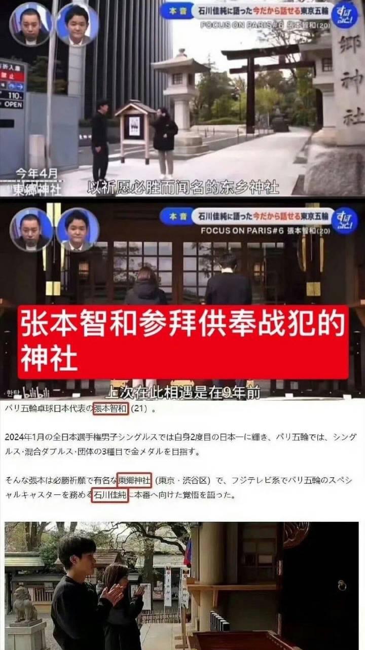 张本智和被央视文章点名! 文章在提及日本文体界接连出现夹带军国主义元素的行为时,列举了张本智和参拜供奉侵略战争战犯的东乡神社。 在2024年4月,日本乒协为了赛前鼓舞士气,特意选了祈福灵验的东乡神社,让张本智和和石川佳纯作为运动员代表去参拜。同一时期,日乒选手早田希娜还不当引用“神风特攻队”言论,当时这一系列行为也引起国内舆论质疑,但随着时间推移,也就渐渐淡了。 如今再提此事,不是翻旧帐,而是向世人揭露,日本全社会根本没有反省历史,反而将侵略者当作英雄,作为鼓舞士气的图腾来参拜,这已经潜移默化融入到普通日本人的生活中,我们不得不警惕。 说句题外话,张本智和此次被点名后,之后在中国媒体恐难见到他了。