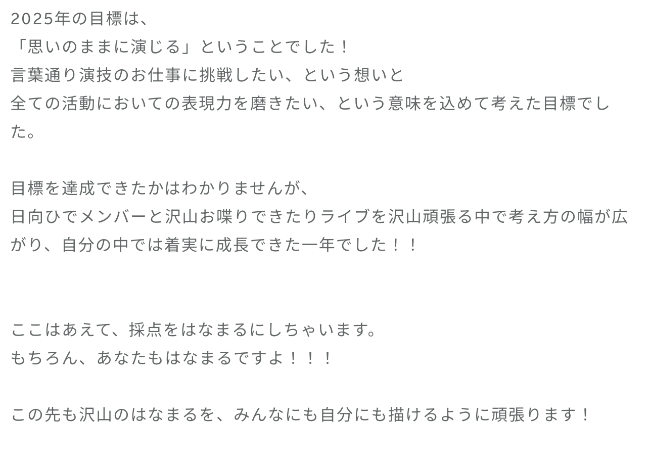ひなの「年明け前、2025年最後に「キュン」2026年最初に「青春の馬」を披露させていただきました。「キュン」は弾むようなハッピーな気持ちを込めて「青春の馬」では午年を強く走り抜けて行きたいという気持ちを込めて。どちらもまた違ったパフォーマンスをお届けできて本当に幸せな時間でした。ありがとうございました⚡️なんとメンバー全員とツーショットを撮れたので…!(今年初の快挙)お正月休みにゆっくり載せていきますね。カメラで撮った写真はまだちゃんと確認できていないので、どうか上手く撮れていますように。」