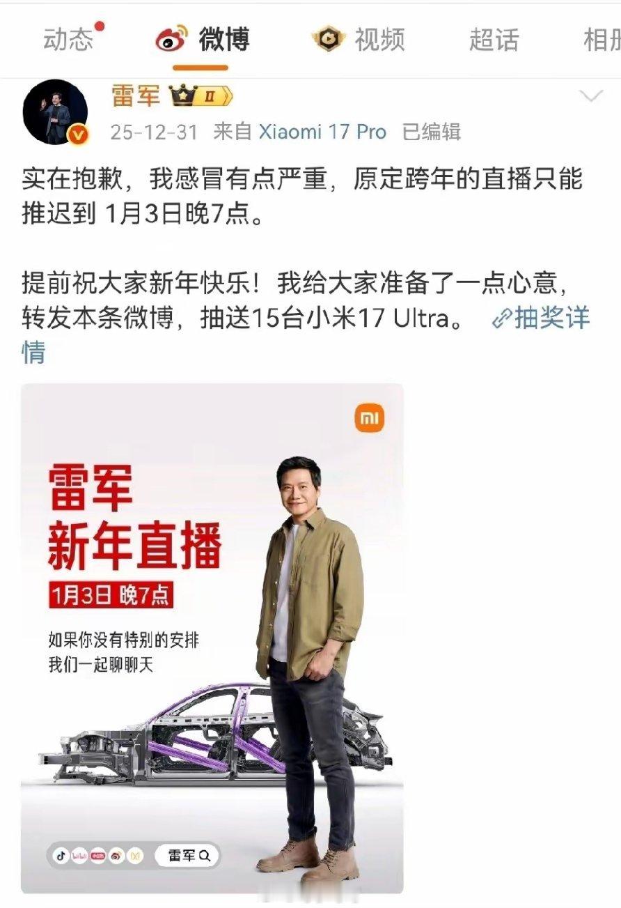看看雷军的影响力:雷军感冒致歉!原跨年直播推迟至1月3日19:00,核心环节工程师现场拆解YU7,同步抽送15台小米17 Ultra,原帖获数十万点赞转发,全网蹲守技术干货小米汽车创纪录!2025年12月交付首破5万辆,全年累计超41万辆,20个月达成50万台下线,刷新全球新能源车企最快纪录,势头太猛小米YU7全系3年0息上线,首付7.49万起、月供4961元起,最高省2.1万利息,2月28日前下定还享4.8万权益+试驾送合金车模,竞争力拉满~