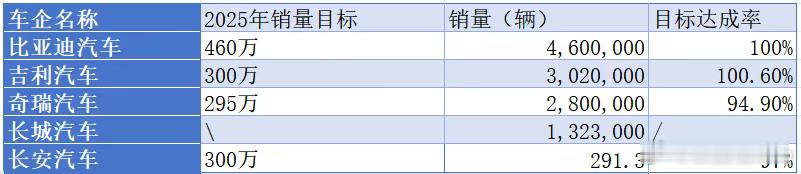 之前按照100万的销量区分,划分了自主五强。但是今年来看,跑在前面的基本已经300万辆以上了。在2025年,比亚迪销量460万,目标完成率100%。吉利完成302万辆,目标完成率100.6%,五家中最高,并且年内两次调高了目标。长安汽车以291.3万的销量,目标完成率达到了97%,位列第三。奇瑞汽车年初仅公布了一个增长率目标,其最低的目标值是295万,按照这个来计算,今年奇瑞销量为280万辆,目标达成率为94.9%。尽管如此,奇瑞的销量还是增长了接近20万辆。长城没有公布2025年的销量目标,此前仅公布过一个长期目标,但2025年开始长城不再追求量的扩张,而是寻求有质量的销量,因此无法统计其完成率。