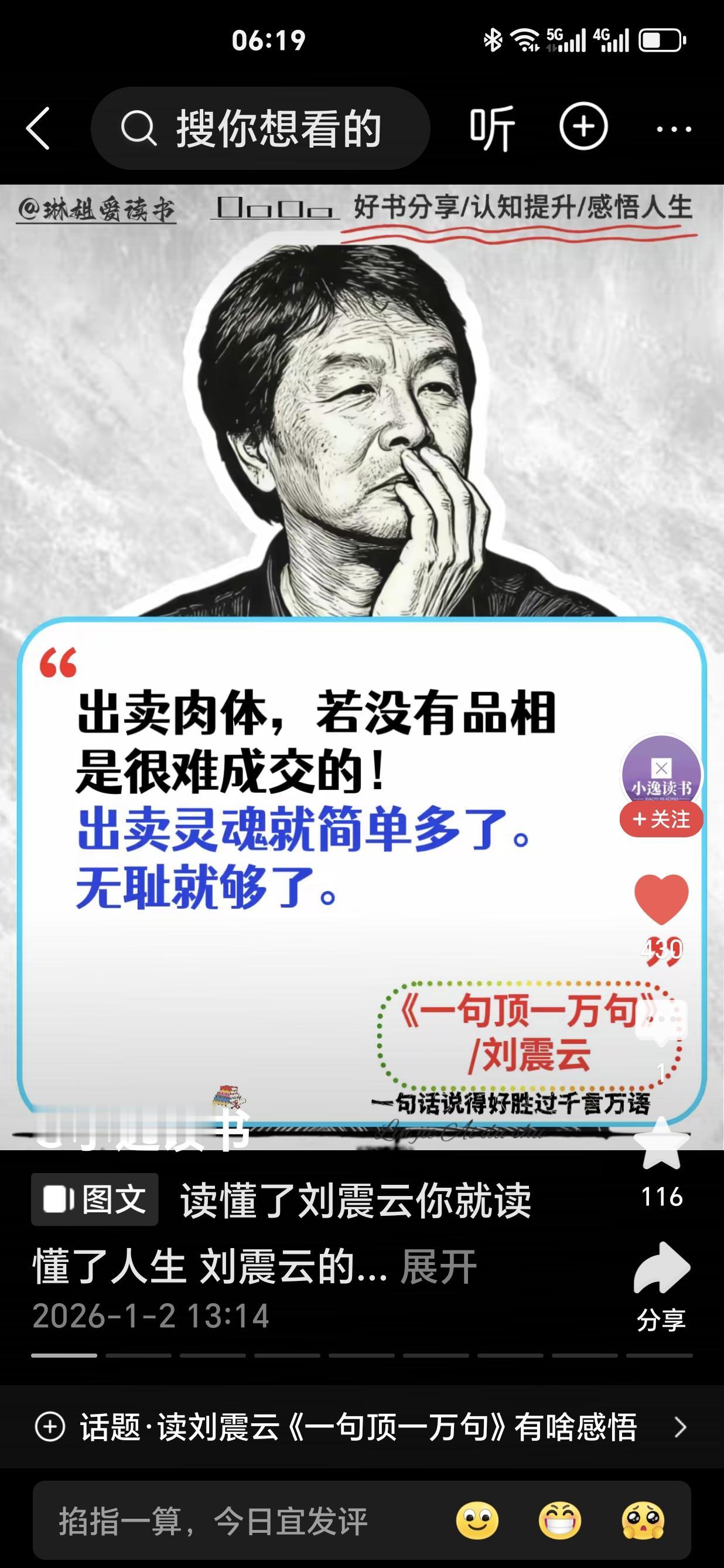 刘震云:“出卖肉体,品相不够很难成交,但若出卖灵魂,只要无耻就够了”。 这样看,自媒体网络上到处充满着无耻,就不难理解了。