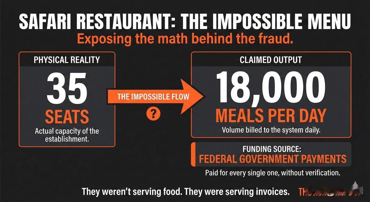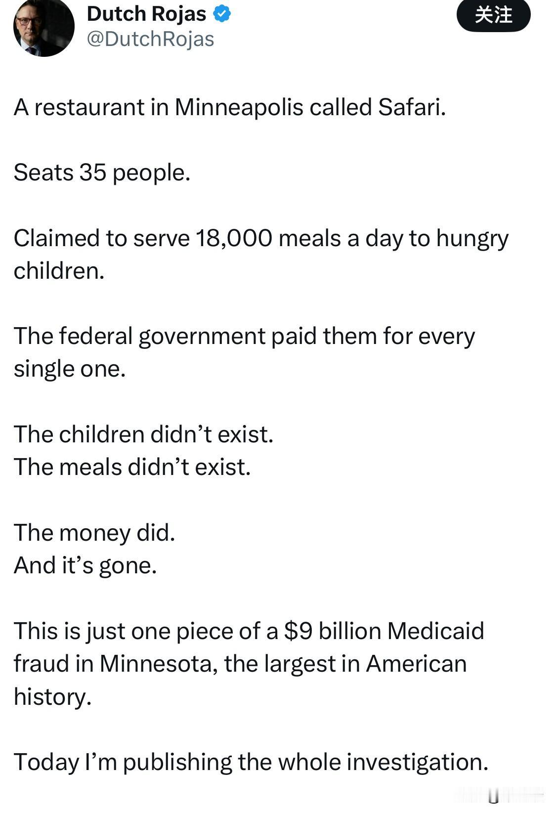美国明尼苏达州明尼阿波利斯一家名为 Safari 的餐厅,餐厅不大,只可容纳35人就餐。他对政府申报说,他们每天要为饥饿的儿童提供 18,000 份餐食。也就是说,这家饭店全天24小时不停歇营业,每分钟都要对外提供12份儿童餐。联邦政府也不核查,为他们申报的每一份儿童餐都支付了费用。但这些孩子并不存在,这些餐食也根本不存在,钱也不见了。 这只是明尼苏达州高达90亿美元的医疗补助欺诈案的冰山一角,这是美国历史上最大的医疗补助欺诈案。