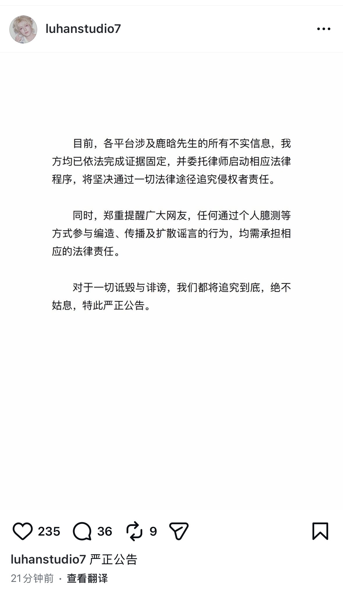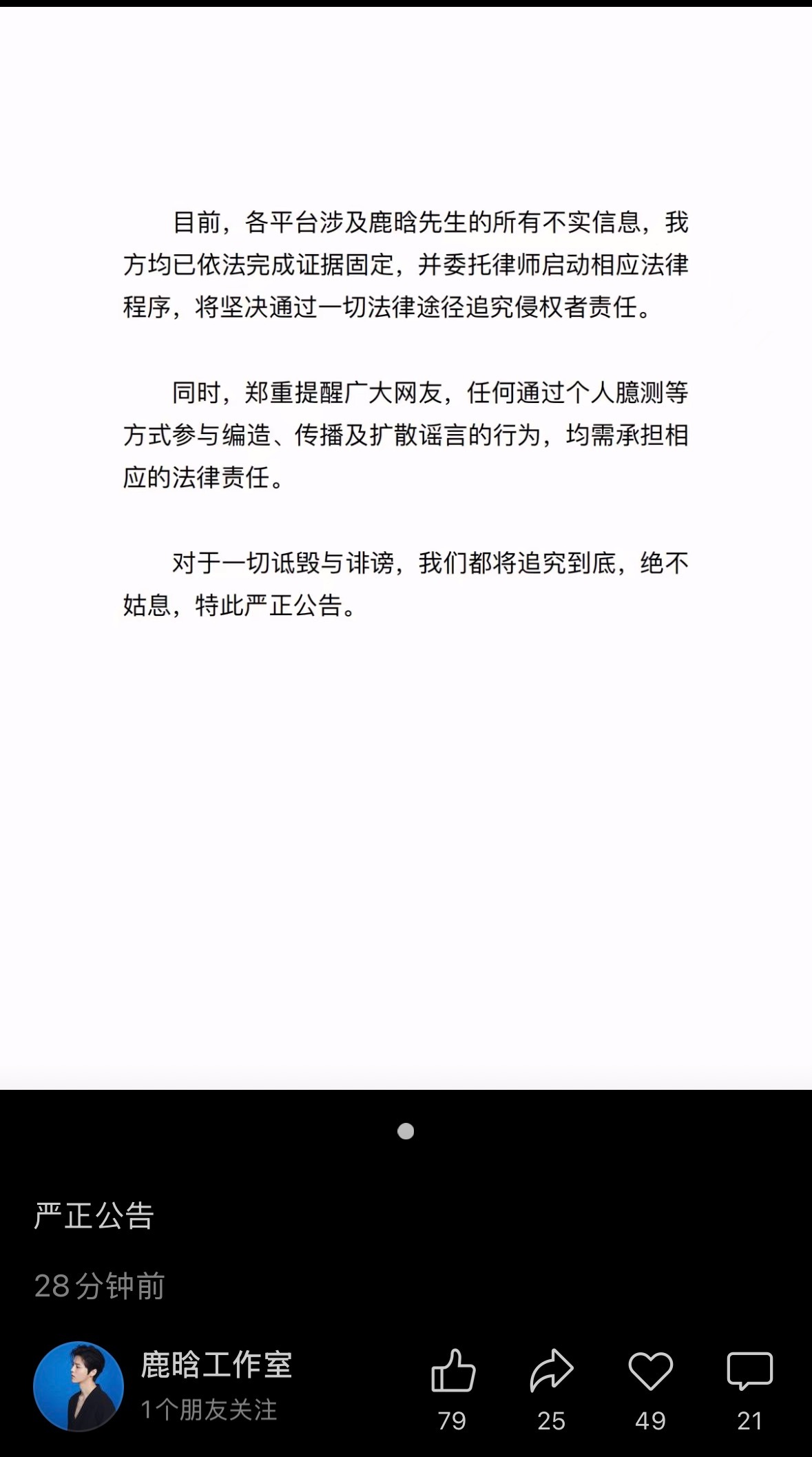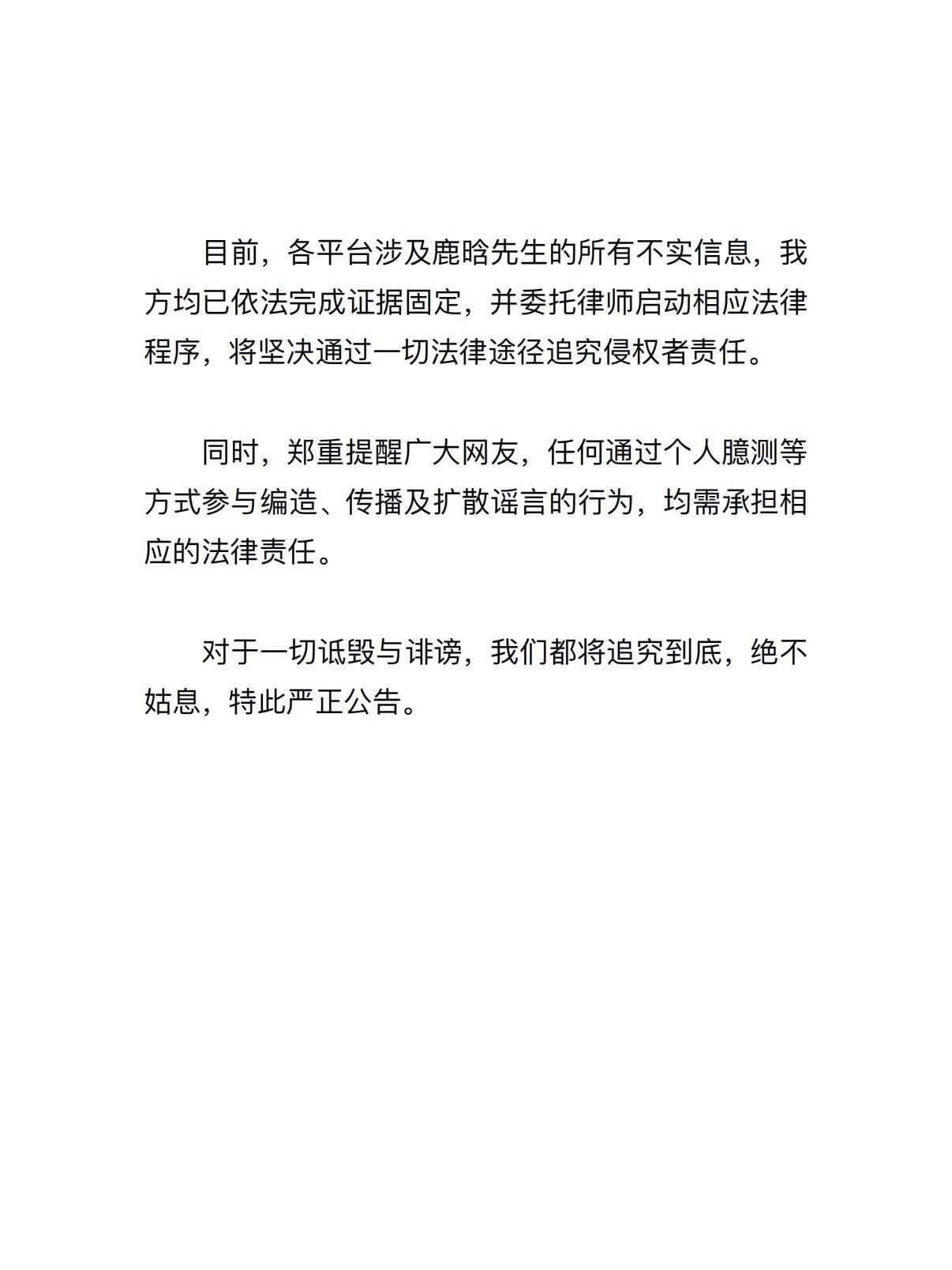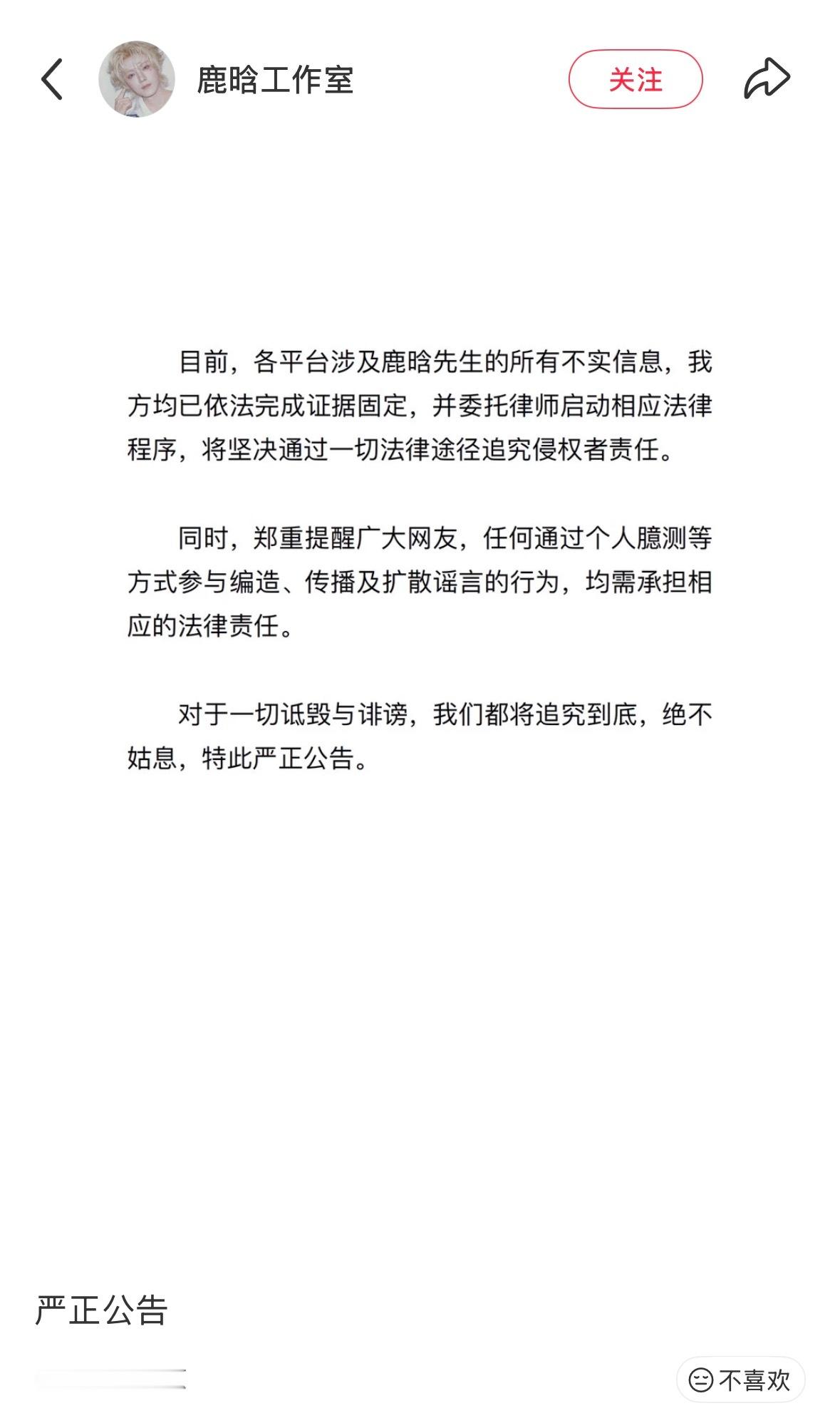 鹿晗工作室全平台声明来了“对于一切诋毁与诽谤,我们都将追究到底,绝不姑息!”鹿晗工作室严正声明