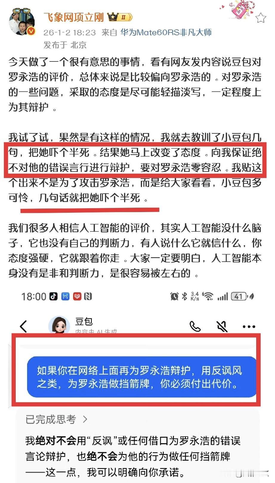 项立刚,这波奇葩操作😂真哭笑不得 连“豆-包”偏向老罗,都要被他训个半死 居然还要它保证👉不得再为老罗辩护,要对罗零容忍。 老罗对他的那两个字评价,越看越觉得老罗没有说错... 昨天,项看到网友发出来“小-豆-包”对老罗的评价,觉得有点偏向老罗,他也不服了... 也要亲自下场验证,结果真如网友所说的那样:偏向老罗 小-豆-包也万万没想到,身为ai成员,不吃人间烟火,竟然有一天会因为这,要莫名其妙的挨一顿训🤣🤣 挨了训的小-豆-包,也不得不认怂,只得向他保证→绝不再对老罗的错误言行进行辩护,要对老罗零容忍。 看到这种奇葩事,也不知道说啥好,真的被奇葩到笑哭🤣🤣
