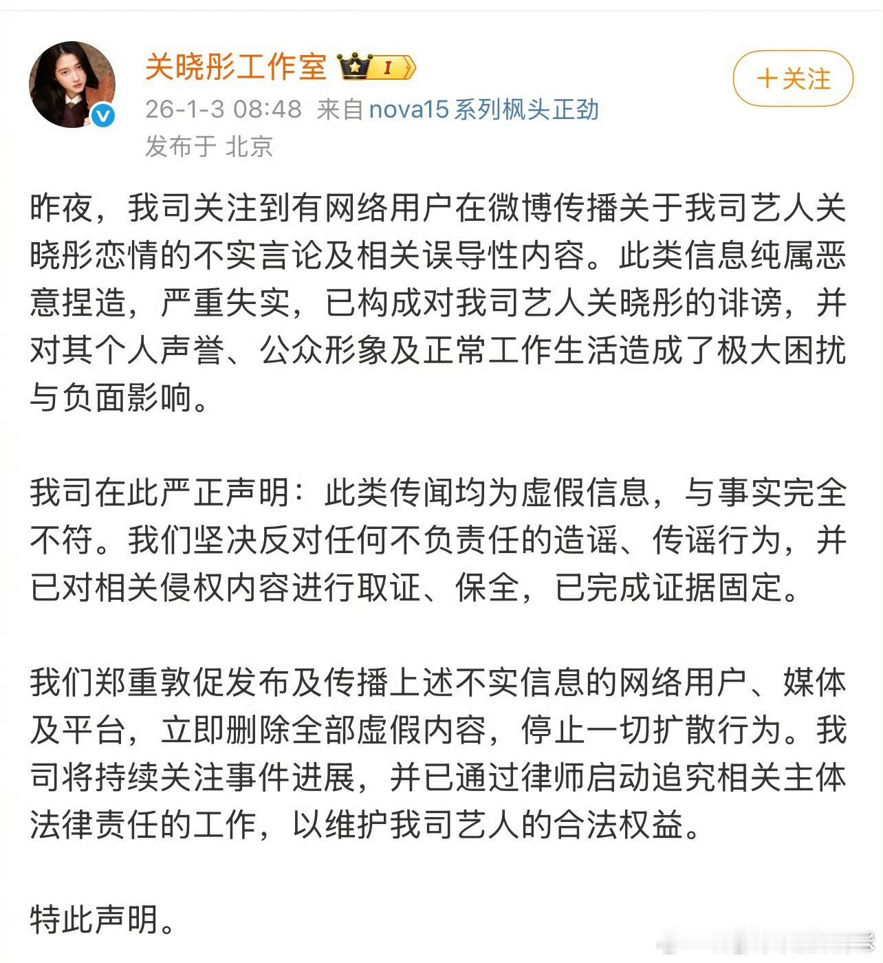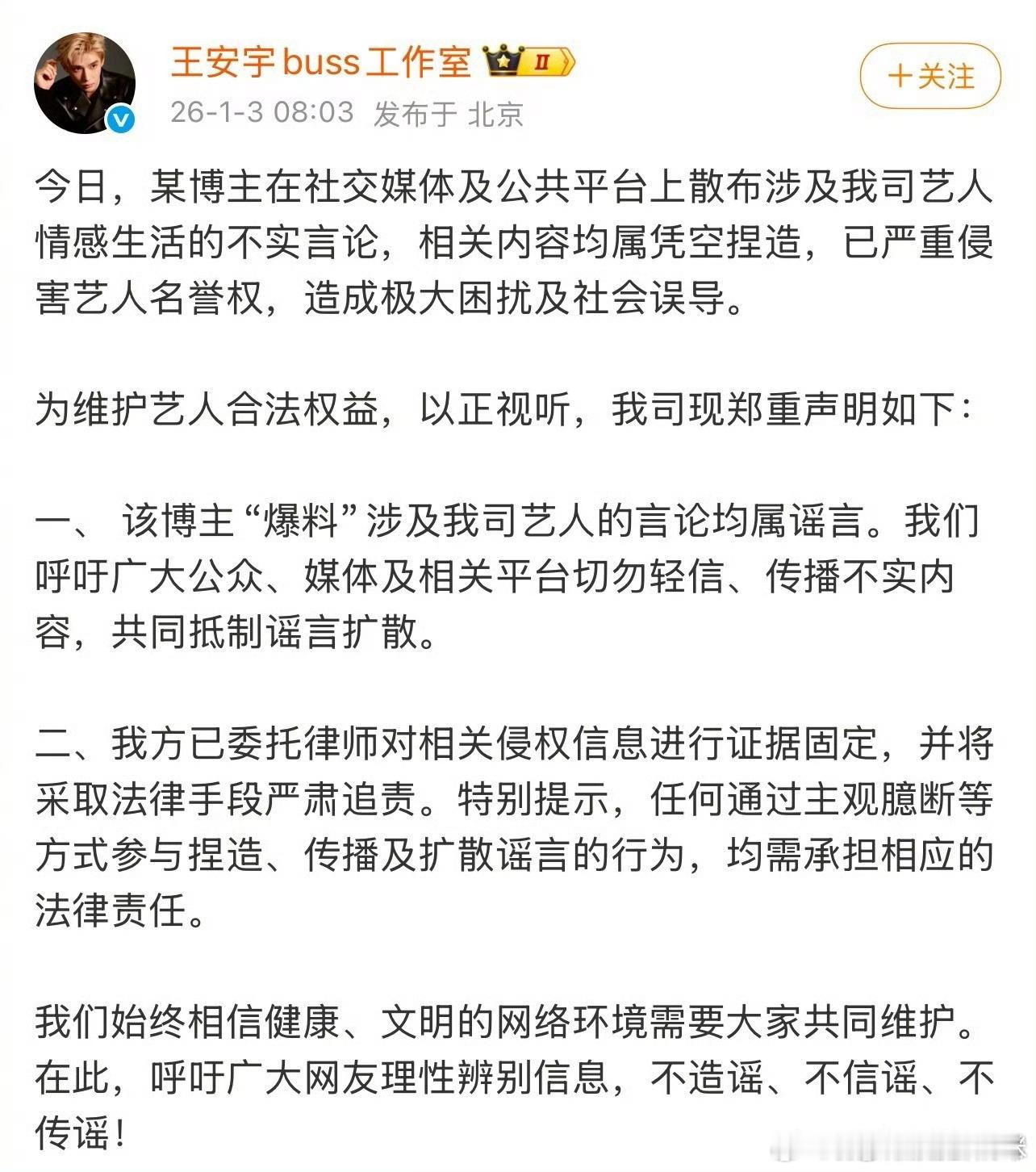 鹿晗、关晓彤、王安宇、檀健次、范丞丞、林更新、黄明昊工作室都针对司晓迪的爆料发否认声明了。其中范丞丞工作室发的最长,林更新工作室虽然字数短但是最贴心,关心她的病情,人还怪好的粉丝稍安勿躁,别急呀,再看看再说,,怎么抖音都有人以檀健次剧粉的名义开始带节奏脱粉了?万一是捡手机文学呢别急呀iamroosie