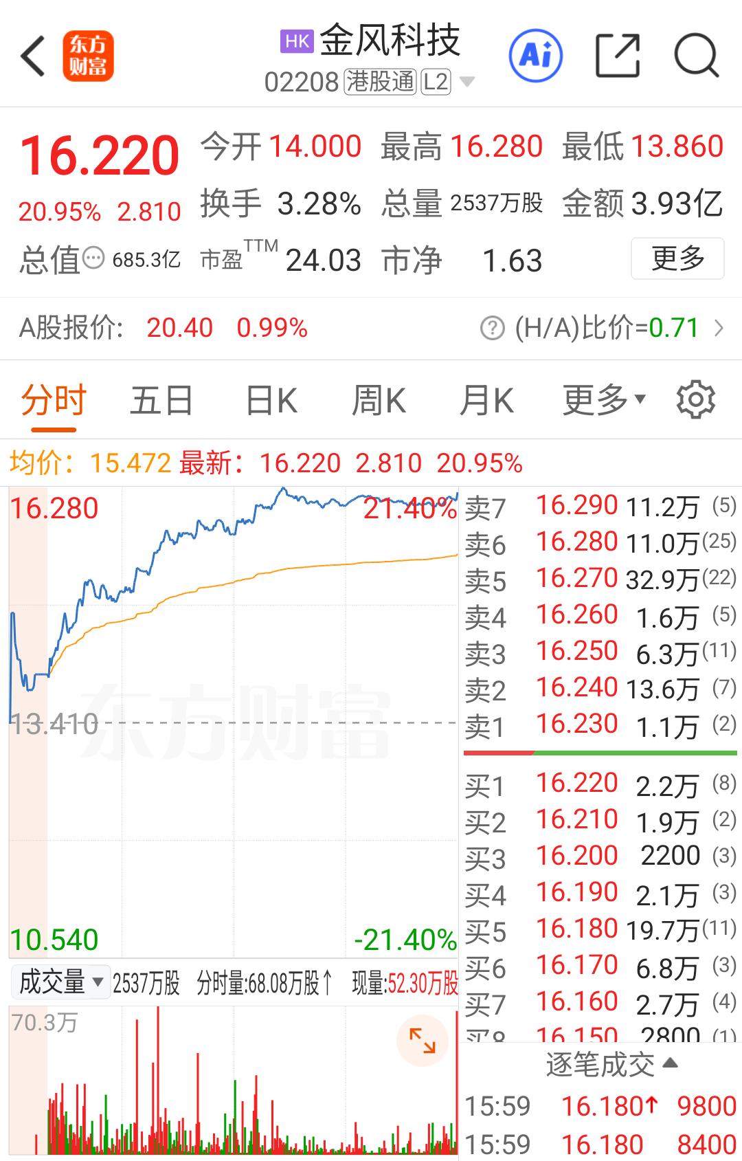 A股休假,港股疯涨,金风大涨20%,A股金风科技还有机会追吗? 昨天星期五,A股继续休假模式,出门嗨了一天,今天早上才瞅了一眼外盘,一看这行情,长假对于一个职业股民来说,又是那么的无聊又漫长啊! 恒生科技指数大涨4%,金风科技因为参股蓝箭航天,昨天更是大涨20%,因此带动A股的金风科技也成为主流股票软件上的关注度第一名。 这样的热度,后天早上还能买到吗? 根据经验,之前有多次,因为某些重大消息促使某些个股关注度极速上升,我专门挑选过排名第一第二的跟踪过或者试买过,但是基本都是大幅高开低走,当日被挂山尖尖的概率相当高。 那么这次商业航天成为主线已经一个半月,跨年之后,还能不能依然成为最牛的主线?金风科技作为蓝箭的投资者,在大航天的背景下,会不会打破以往的定律?不要高开低走呢! 这样的问题,我是肯定不敢提前预判,只能走一步看一步,要是直接一字板,大单封死,那就没机会了,要是高开幅度八九个点,感觉也是有点操心,若是高开幅度不是太大,还能试试水。 具体会是什么样的走法,我们下周一拭目以待吧!