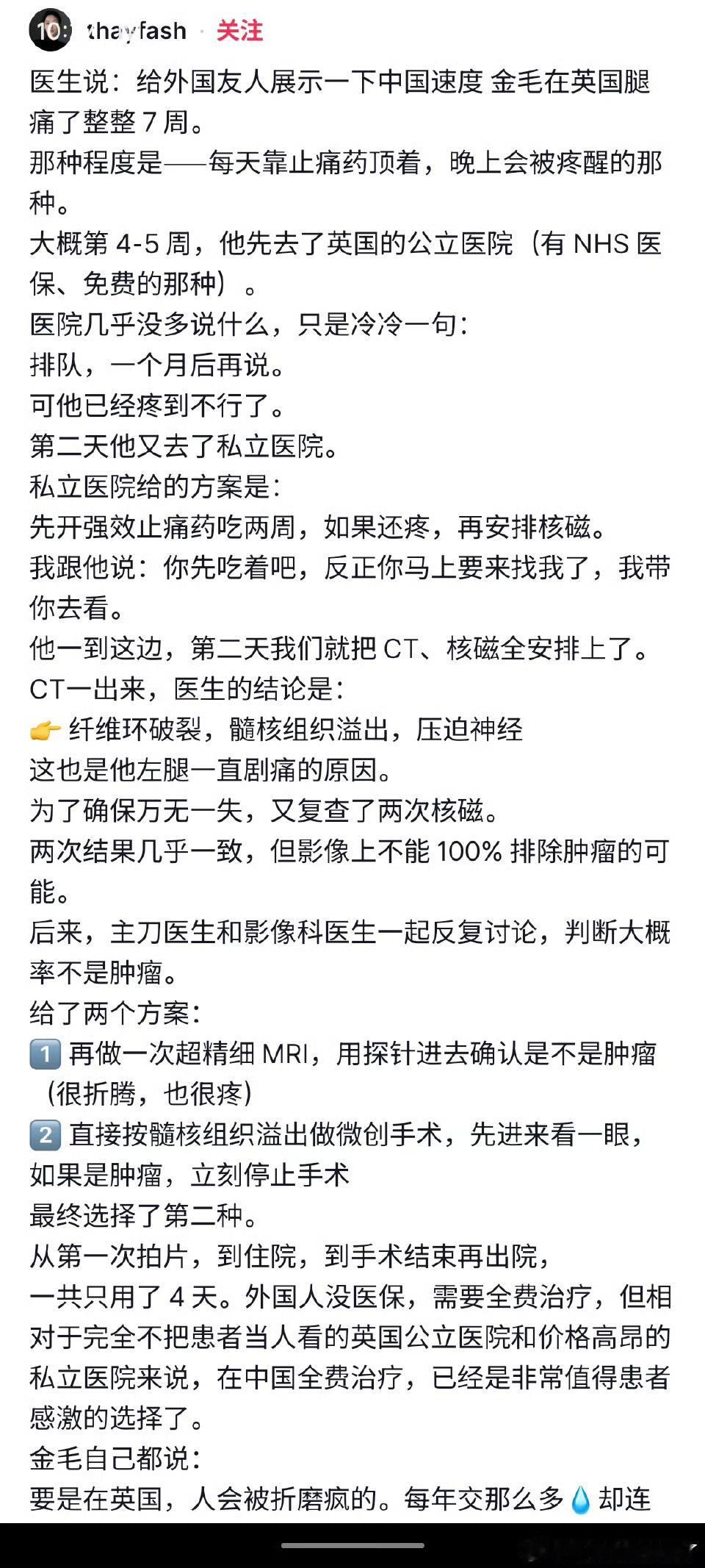 太提气!英国痛7周治不好,中国4天搞定!老外扎堆来中国看病,真相扎心了 家人们谁看了不骄傲!最近一条新闻爆火:有人在英国被病痛折磨7周,各种检查治疗都没见效,结果飞回中国仅用4天就痊愈了!更让人震惊的是,中国核磁共振成像才80美元,而美国居然要8000美元,差了整整100倍! 以前总听人吹外国“免费医疗”多香,现在才知道都是“美丽的谎言”!所谓免费,要么是排队排到天荒地老,小病变大病;要么是隐形消费一大堆,最后花的钱比自费还多。反观我们中国,不仅医疗技术过硬,价格还实在到感人——检查快、治疗准、花钱少,难怪越来越多外国人不远万里飞来中国看病,直言“这才是真正的医疗福利”! 有人说“医院接待外国人士医疗费可以再涨涨”,其实咱中国医疗的优势从不是靠抬价,而是靠性价比和硬实力!医生专业负责,设备先进齐全,不用漫长等待,花小钱就能解决大问题。不管是国人还是外国友人,都能感受到这份实实在在的医疗保障,这就是中国医疗的底气! 现在越来越多老外主动为中国医疗点赞,这就是最真实的口碑!咱们自己习以为常的医疗便利,在外国人眼里都是“香饽饽”。 你身边有没有外国人来中国看病的经历?你觉得中国医疗最牛的地方是什么?欢迎在评论区聊聊!中国医疗太给力 中外医疗大对比