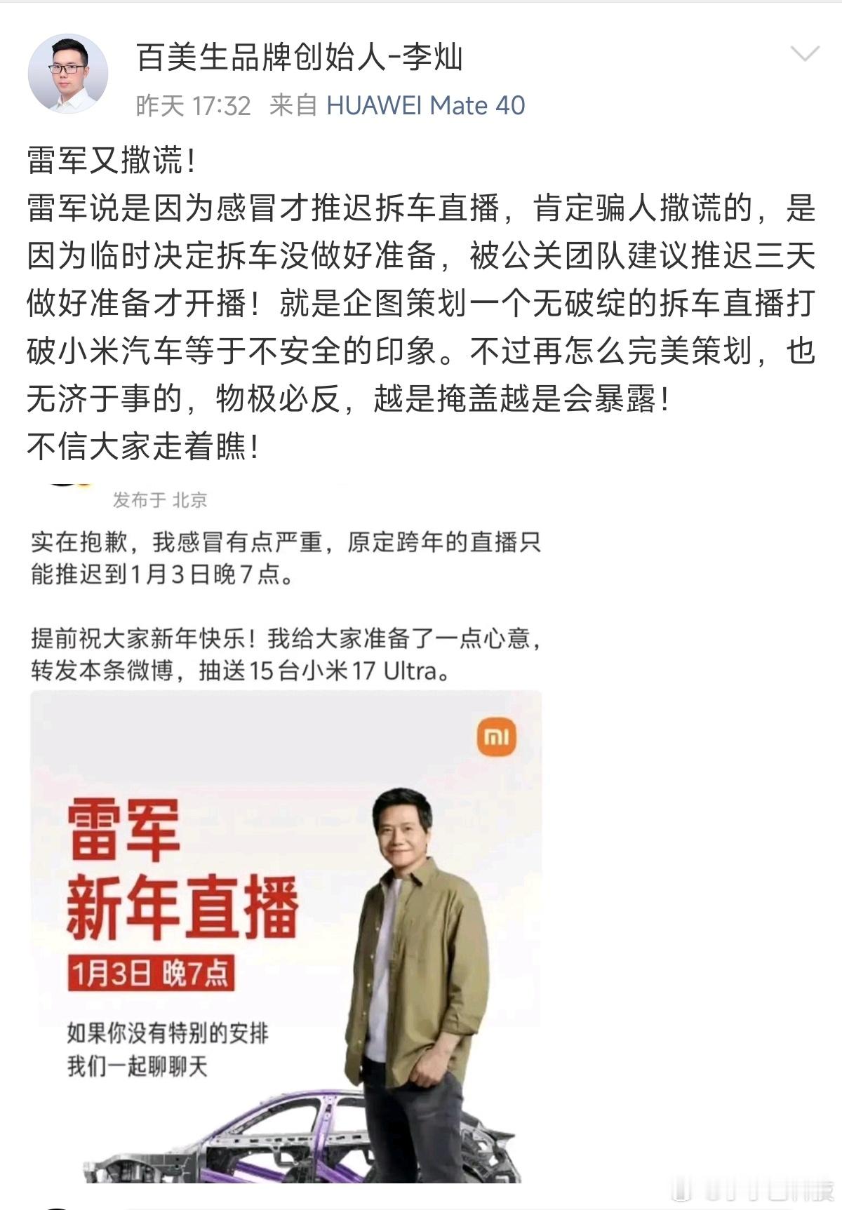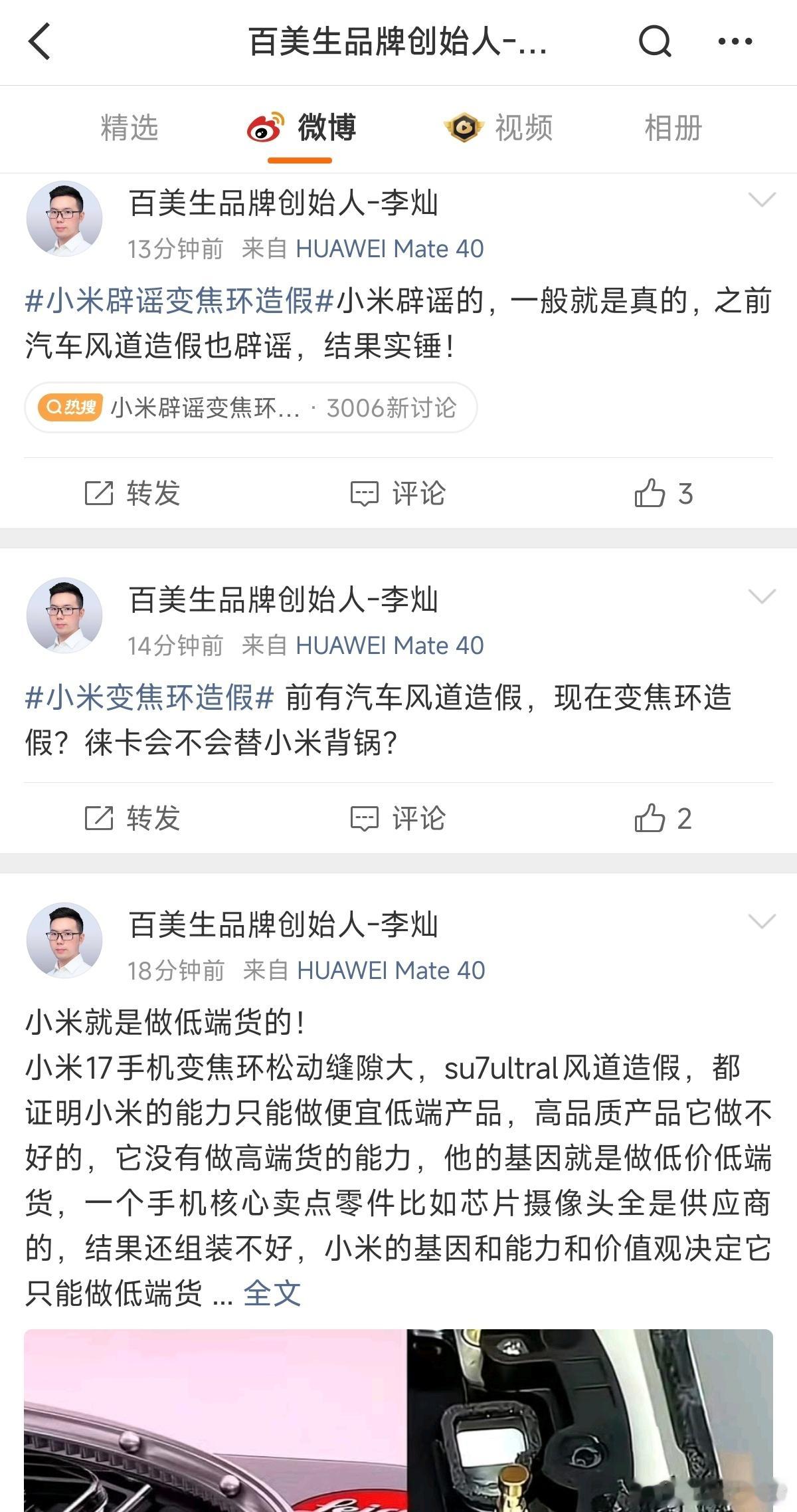 围脖侠,来看下这位博主造谣雷军推迟直播说是撒谎,这算不算攻击企业家? 也来了看下,如此造谣、抹黑雷军,说小米变焦环辟谣不是辟谣,是造假。
