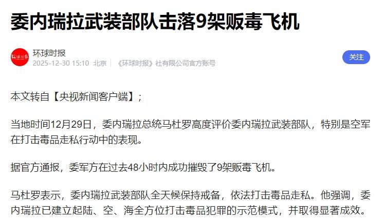 委内瑞拉确实是受到高人指点了,棋局由被动化为主动......委内瑞拉在短短48小时内一口气摧毁9架贩毒“幽灵飞机”,还端掉了4个藏在南部雨林里的贩毒后勤营地,总统马杜罗高调宣布这是“国家主权与法治的胜利”。 委内瑞拉在短短48小时内,以雷霆之势连续摧毁了9架深入其领空的贩毒“幽灵飞机”,并顺藤摸瓜,一举端掉了4个隐藏在南部亚马孙州与巴西接壤地带的后勤营地。 这些飞机之所以被称为“幽灵”,是因为它们关闭了应答器,没有合法的飞行计划,是典型的“黑飞”,专门用来规避雷达监控。 就在不久前,美国方面才刚刚升级了对委内瑞拉的压力,特朗普亲自证实,美国对委内瑞拉境内一个据称用于装载毒品的码头设施发动了袭击,并宣称该设施“已不复存在”。 这被外界普遍视为美国“南部长矛行动”中首次公开承认的对委内瑞拉本土的打击,是一次重大的事态升级。 美国的叙事逻辑很清晰:将马杜罗政府描绘成一个“贩毒国家”,并以此为由,进行经济封锁、军事施压,甚至直接采取越境打击行动。 按照常规剧本,委内瑞拉可能会陷入无休止的谴责和抗议循环,彻底沦为被动应付的一方,但这次,委内瑞拉没有按常理出牌。 它没有纠缠于是否真的发生了码头袭击事件,而是选择了一个全新的战场,用一场无可辩驳的、成果显著的国内缉毒行动,来回击外界的指控。 美国指责委内瑞拉是“毒品中转国”,委内瑞拉就用击落贩毒飞机的实际行动来证明自己是禁毒战线上的积极行动者,这远比口头上的否认更有说服力。 它向国际社会展示:委内瑞拉非但不是毒品的源头或保护伞,反而是深受其害并坚决打击的一方。 这些毒品大多源自邻国哥伦比亚,委内瑞拉只是贩毒集团利用的过境通道,通过高调展示战果,委内瑞拉正在重塑自己的国际形象,将自己从“问题制造者”转变为“问题解决者”。 官方数据显示,仅在2025年一年,委内瑞拉就摧毁了39架贩毒飞机,而自相关法律生效以来,累计摧毁的飞机数量已高达430架。 就在这场雷霆行动前后,马杜罗在一次新年采访中,出人意料地向美国伸出了橄榄枝,他明确表示,委内瑞拉愿意与美国就打击贩毒和美国投资其石油部门等议题,进行“认真的对话”。 他强调,对话可以在美国“希望的任何时间、任何地点、以任何方式”进行。 这手牌打得非常聪明,一边是展示肌肉,证明自己有能力捍卫主权、维护国内法治;另一边是释放善意,摆出愿意合作解决问题的姿态。 这种“软硬兼施”的策略,将难题抛回给了美国。 如果美国拒绝谈判,就显得不愿通过和平方式解决问题;如果美国同意谈判,就必须在一个相对平等的地位上,承认委内瑞拉作为禁毒合作方的主权地位,而不是单方面施压的对象。 你认为委内瑞拉这波操作算是成功的破局之举吗? 信息来源:环球时报 委内瑞拉武装部队击落9架贩毒飞机