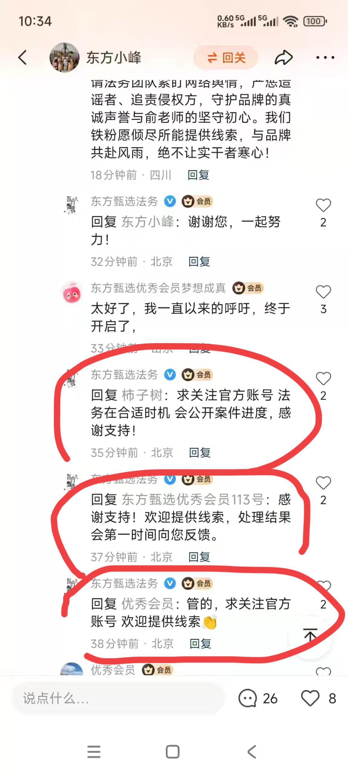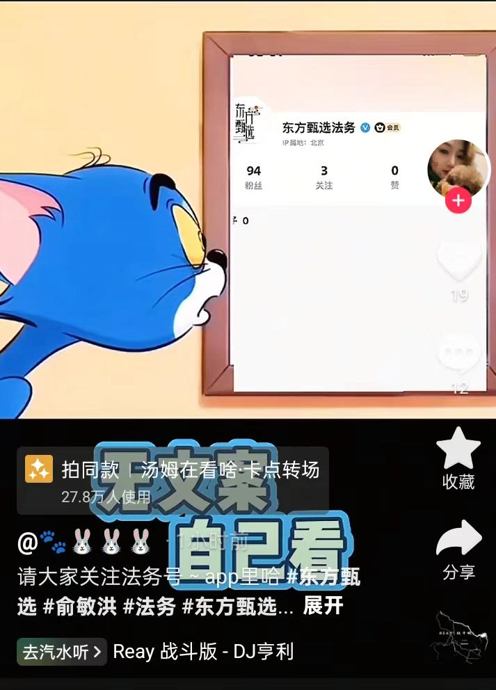 东方甄选法务入驻抖音了! 昨天一官宣, 几只苍蝇就飞到我的评论区威胁我, 说叫我小心点, 东方甄选法务已经在整理我的材料, 据说有半尺高了, 接下来要对我下刀。 呵呵呵, 我笑死了, 起诉我? 理由呢? 我作为一个网民, 对他们的一些言行和商业行为合理合法的发出一些质疑, 是诋毁还是造谣? 一个商业直播平台, 难道还不允许网民发出质疑? 我没直播卖货, 也不存在商业竞争。 我不知道我需要怕什么? 其实法务部门入驻抖音好啊, 对公司合法维护, 其实我也建议与辉同行可以效仿, 让法务动起来, 对那些假冒与辉同行消费者身份对产品诋毁造谣的人, 合理合法的追责。 法务上线, 说是要对一些造谣的声音从源头抓起, 还欢迎大家提供线索。 其实线索就是现成的, 比如罗永浩长期内涵谩骂俞敏洪。 还有最近那个曝光驼奶粉虚假宣传的老陈, 公然挑衅喊话东方甄选, 这样现成的线索, 东方甄选法务应该支棱起来, 对罗永浩和老陈追责。 法务入驻抖音, 会不会规范他们公司的一些粉丝的言行, 比如那个什么“XX柯德”, 他群里的一些人恶语攻击董宇辉, 还有一些铁粉, 假冒与辉同行消费者出来攻击与辉同行产品, 算不算恶意竞争? 会不会出来规范提醒呢? 支持东方甄选法务, 对罗永浩和挑衅公司的老陈起诉追责, 不知道我这算不算提供线索, 有没有奖励? 散会! 东方甄选