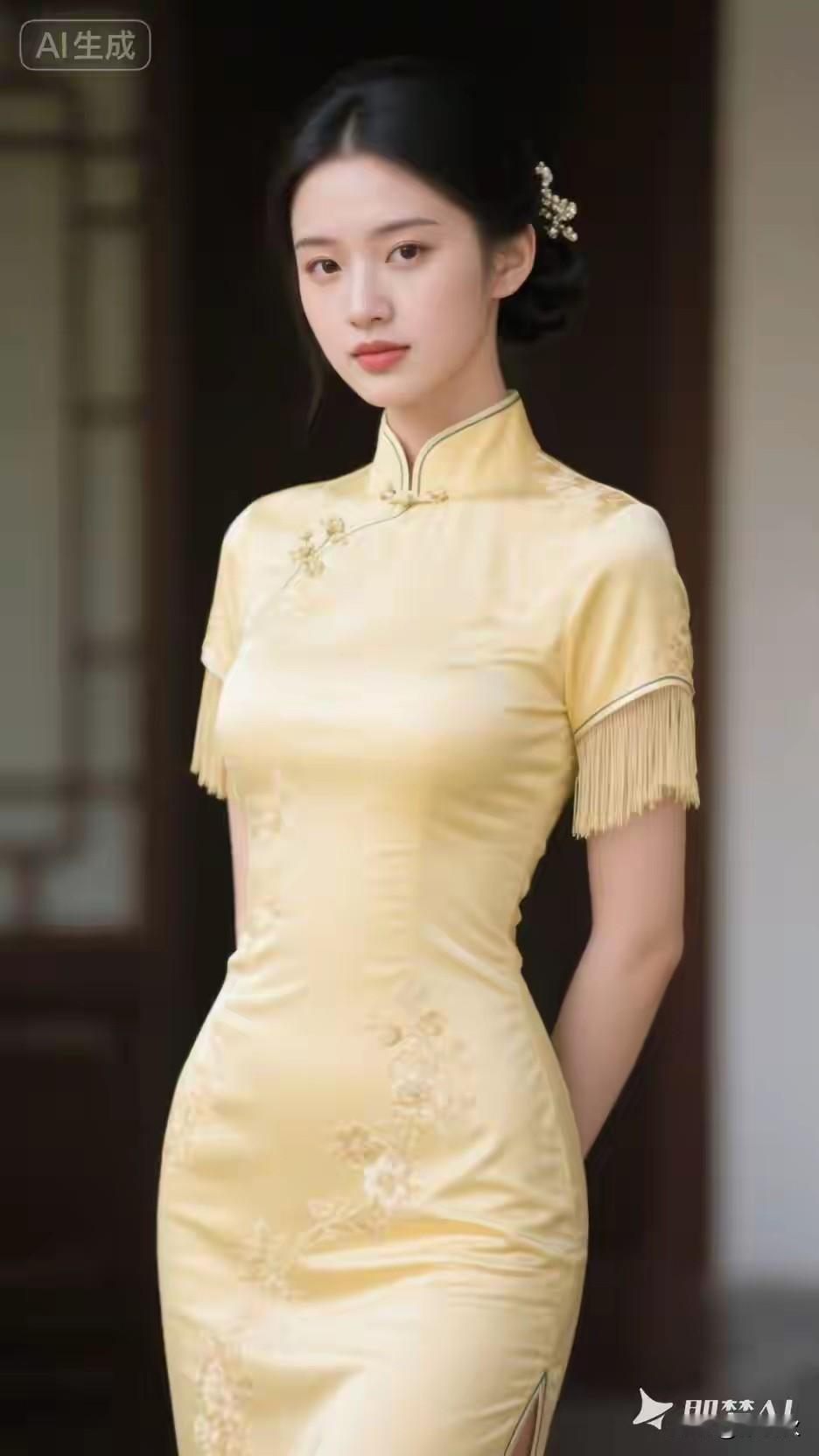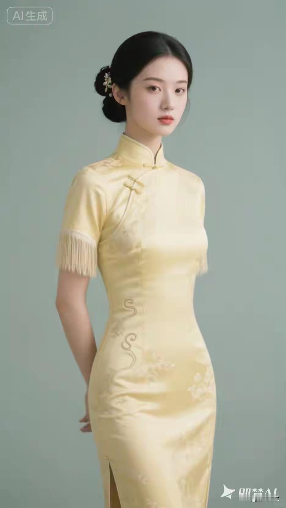 中国文化,传统服饰 黄色刺绣,缎面旗袍 东方韵味,魅力十足 出水芙蓉,亭亭玉立 樱桃小口,柳眉星眼 小家碧玉,花容月貌 玉颜如莲初绽放, 不沾尘世半分埃。