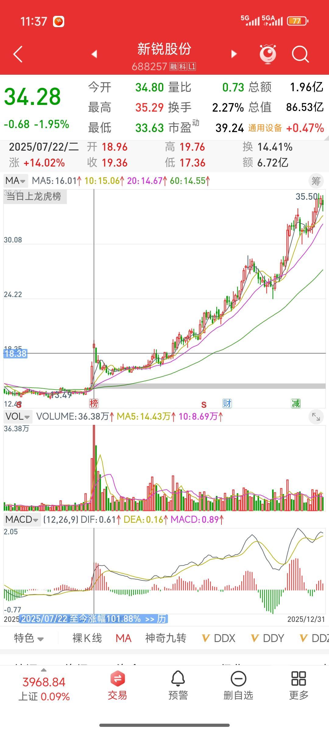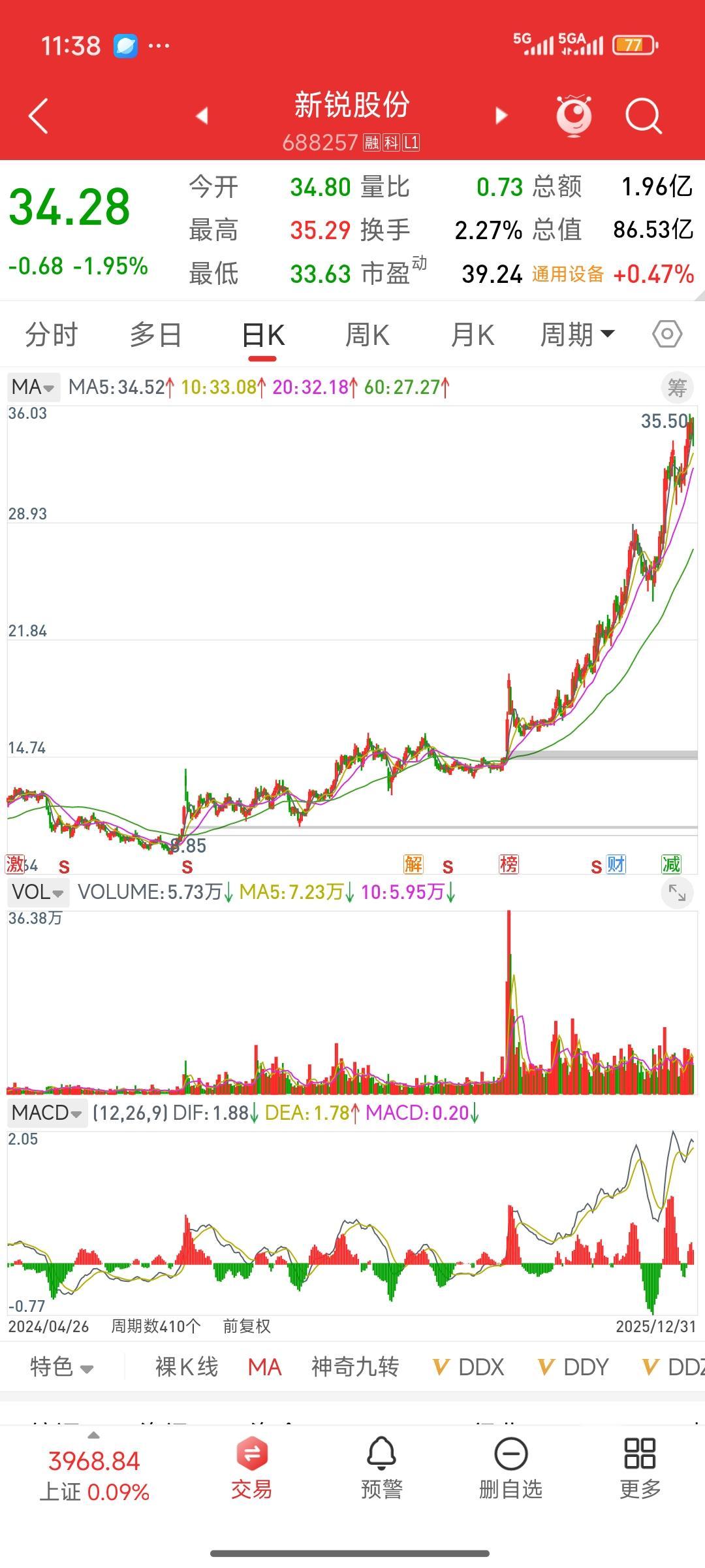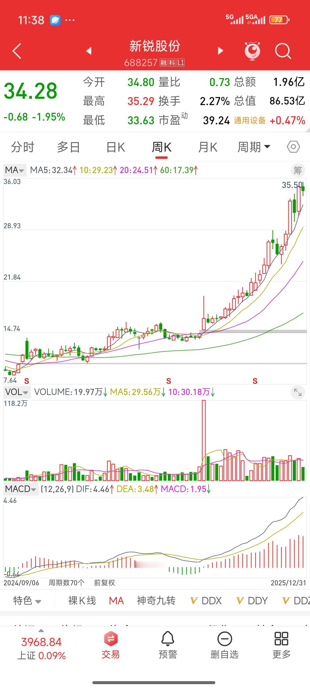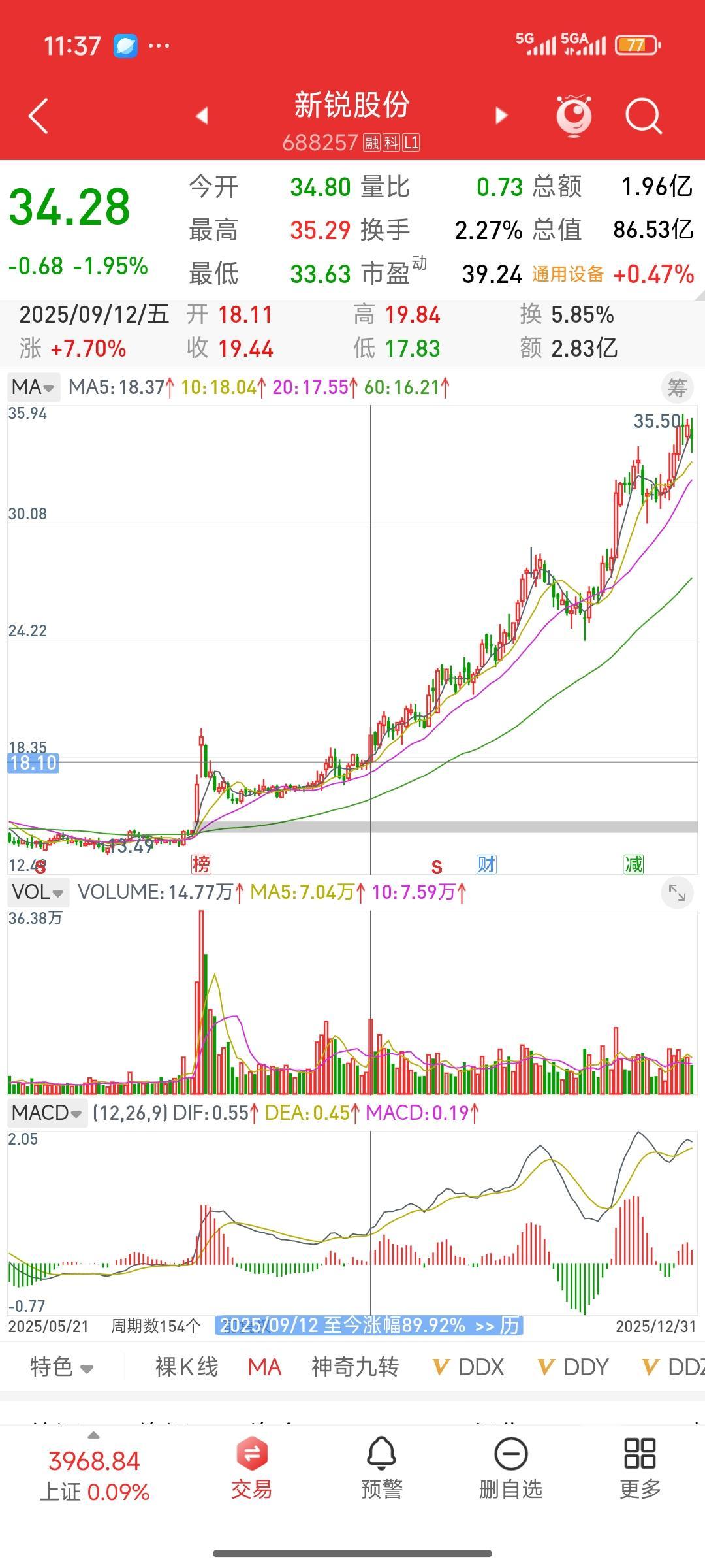 发现一只自选股里的牛股,新锐股份。今天来给它复盘一下。实际上在7月,它连续两天突然放量大涨,每天涨幅都达百分之七八。这放量程度是平时的10倍。因为放量,我把他拉到自选股里面进行观察后面呢,可能沉寂了一两个礼拜,魏局长就没有再关注了,结果这个股票经过持续两个月的横盘调整,再次大涨7%后便开启了一轮45度的持续上升走势。到今天将近三个月,股价已然翻倍。 今天复盘自己的自选股,真是拍大腿后悔,竟错过这样一只牛股。我向来喜欢做那种长期在底部盘整、突然放量的股票。这种放量往往意味着有资金抢筹、主力入驻,是需要持续观察的。所以每天不能偷懒,起码每周都要对自己的自选股和关注股进行复盘。像这种突然连续放量两天的股票,可以加到自选股里观察。它不会马上拉升,但我们可以持续跟踪,看看主力意图。 这只股票的走势正是我最喜欢的,可为何又与它失之交臂?虽说它的核心概念并非当下热点,但要是真找到这样的走势,那就太好了。这种走势简单直接,就像是主力在明白无误地宣告:我要进来了。这样的主力往往不狡诈,与这样的主力为伍,通常能获得不错的收益。 低吸潜力股 潜力股排行 成长潜力股 高成长股 消费潜力股 股市潜力股 挖掘潜力概念股