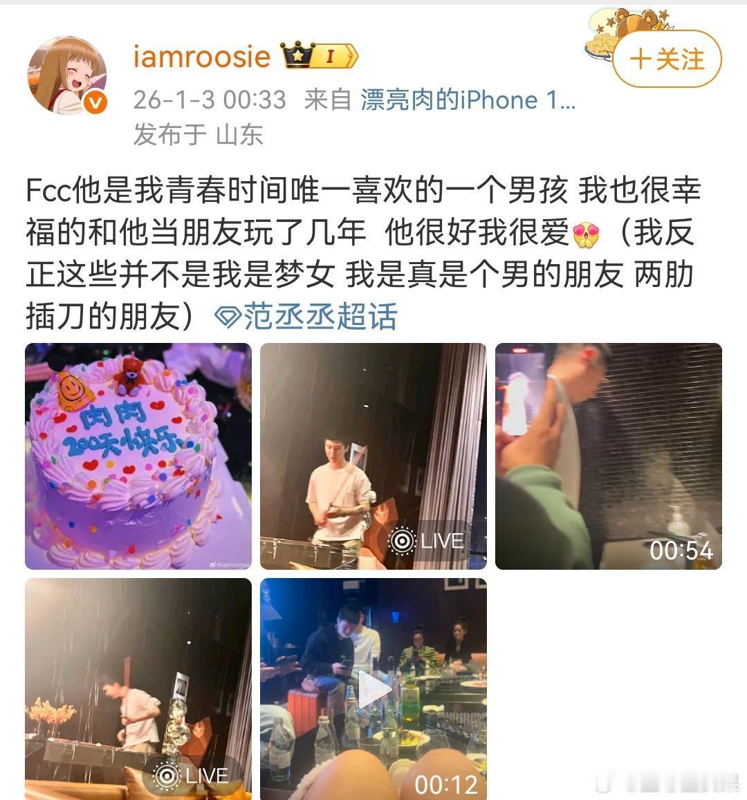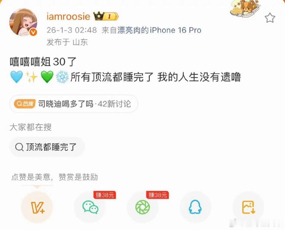 博主iamroosie深夜爆料与内娱多名男艺人存在亲密关系2026年1月3日,iamroosie (司晓迪)在凌晨通过微博连续爆料与鹿晗、范丞丞、林更新、张一山、檀健次、蔡徐坤、黄明昊、周奇等十余名男顶流艺人存在私密关系,引发内娱地震。司晓迪自称因多名男艺人“把自己当玩物”导致自己患上严重抑郁症,并特意点名林更新。目前,多名相关男星工作室已发布声明紧急辟谣!司晓迪 可汗大点兵