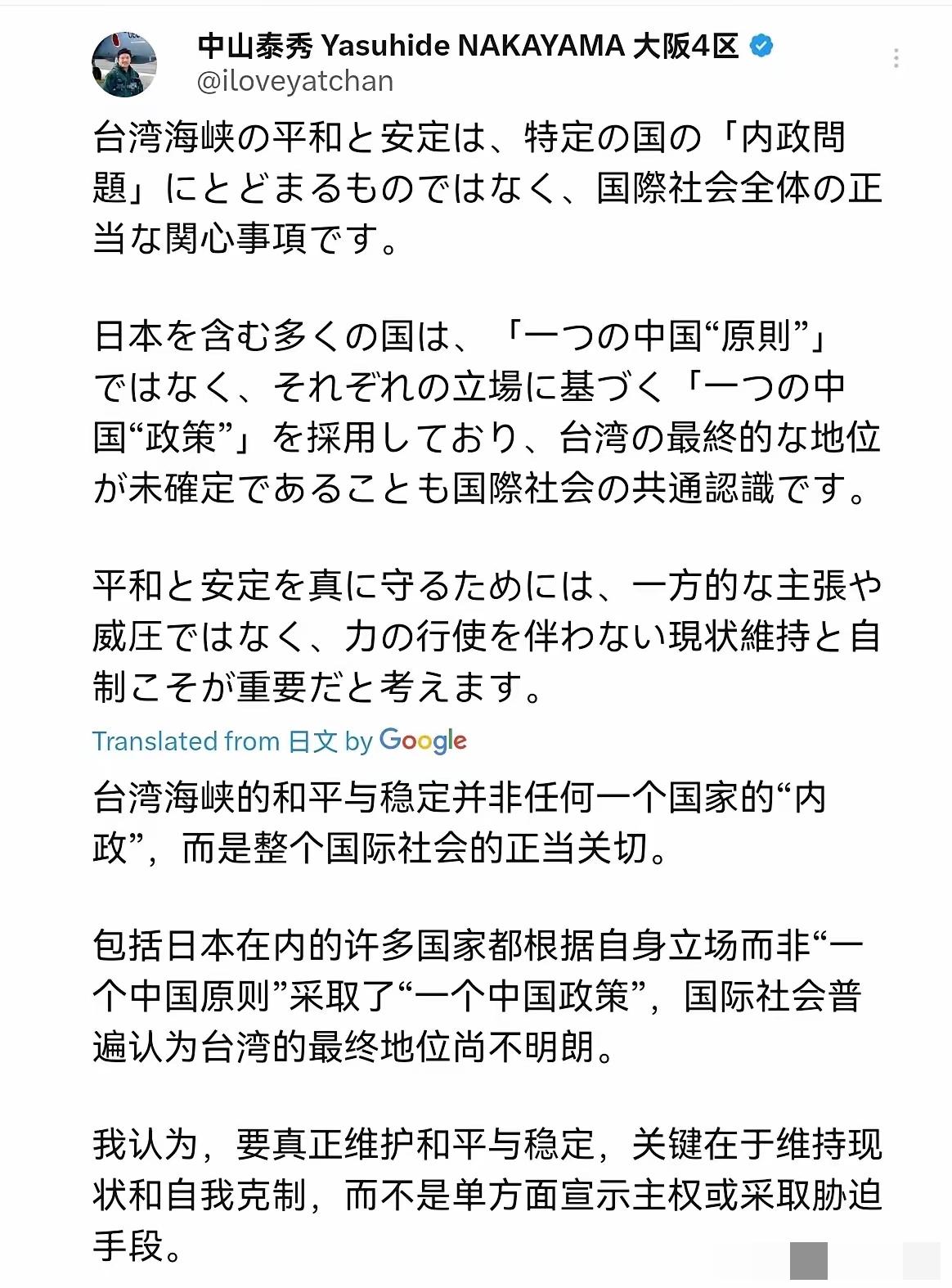 1月3日,日本前防卫副大臣中山泰秀称,台湾海峡的和平稳定,并非任何一个国家的内政,而是整个国际社会的正当关切。包括日本在内的许多国家,根据自身立场而非“一个中国原则”,而是“一个中国政策”,台湾的最终地位“尚未确定”,这也是国际社会的共识。 此人是日本极右翼势力代表,极不友好人士,且鼓吹挑动不支持“一个中国原则”。他常常拿中国和俄罗斯说事,曾将俄罗斯在夏威夷附近的军事演习,比作二战时日本偷袭珍珠港。 看看中山太秀的言论有多可笑,台湾是中国的一部分,这是国际社会的普遍共识,而并非他颠倒黑白的胡言乱语。把干涉中国内政描写的如此理直气壮,不知道哪里来的底气和决心?自己都不觉得可笑吗, 我国军演后,一些国际组织和相关国家纷纷发表与他们毫不相干的评论,指责与抗议并存,担忧与害怕交织,典型的长臂管辖,妄议是非,与他们八竿子打不着的事情却还想着管一管,说一说。 所以说,这次军演,不仅是一次打击“台独”分裂势力的郑正宣告,更是一次发现牛鬼蛇神的绝好机会,那些企图拿台湾说事的极端分子,注定也只能是发发毫无用处的牢骚而已。