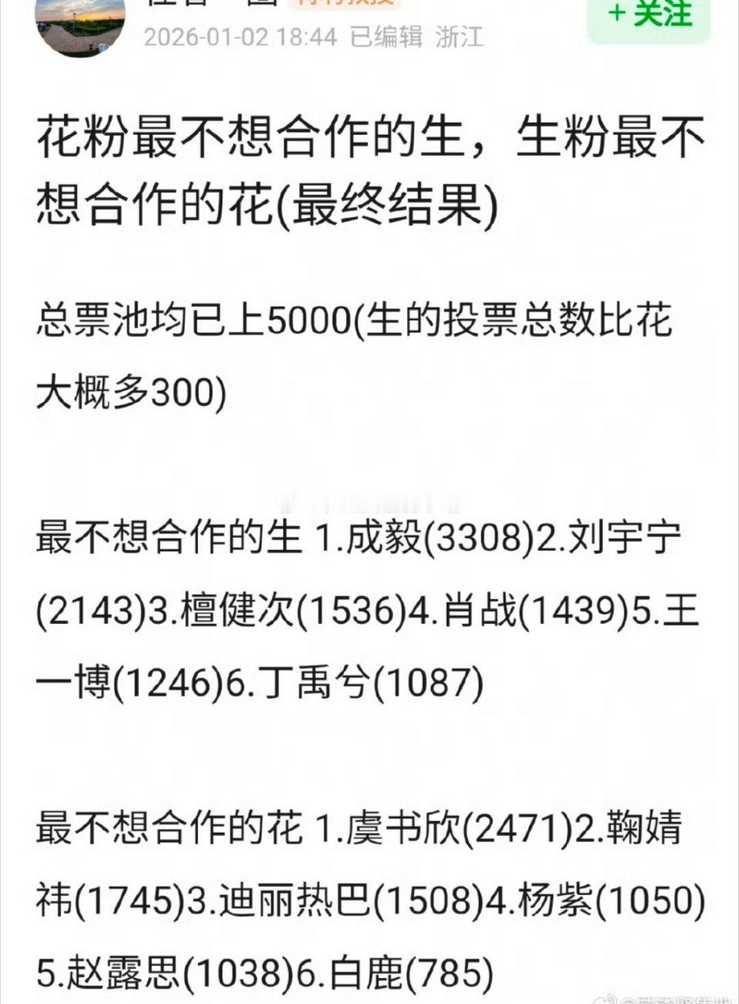 花粉最不想合作的生,生粉最不想合作的花《票选最终结果》,全都是流量最火的哈哈哈