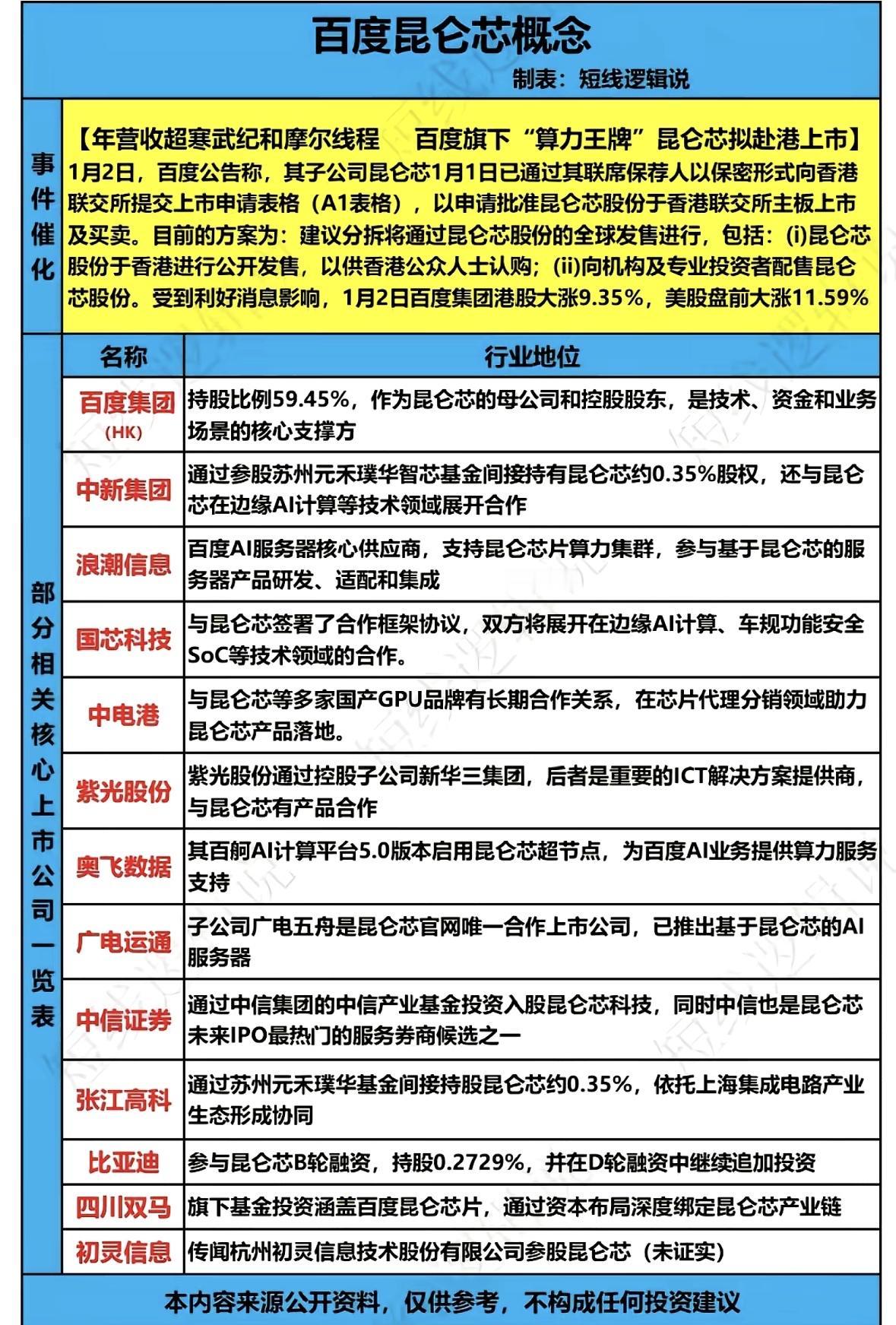 百度昆仑芯概念股一览表 看看哪家是最正宗的未来科技概念股 百度旗下昆仑芯拟赴港上市,对A股上市公司 影响巨大。 带动股价大涨,多家企业合作布局AI算力产业链。