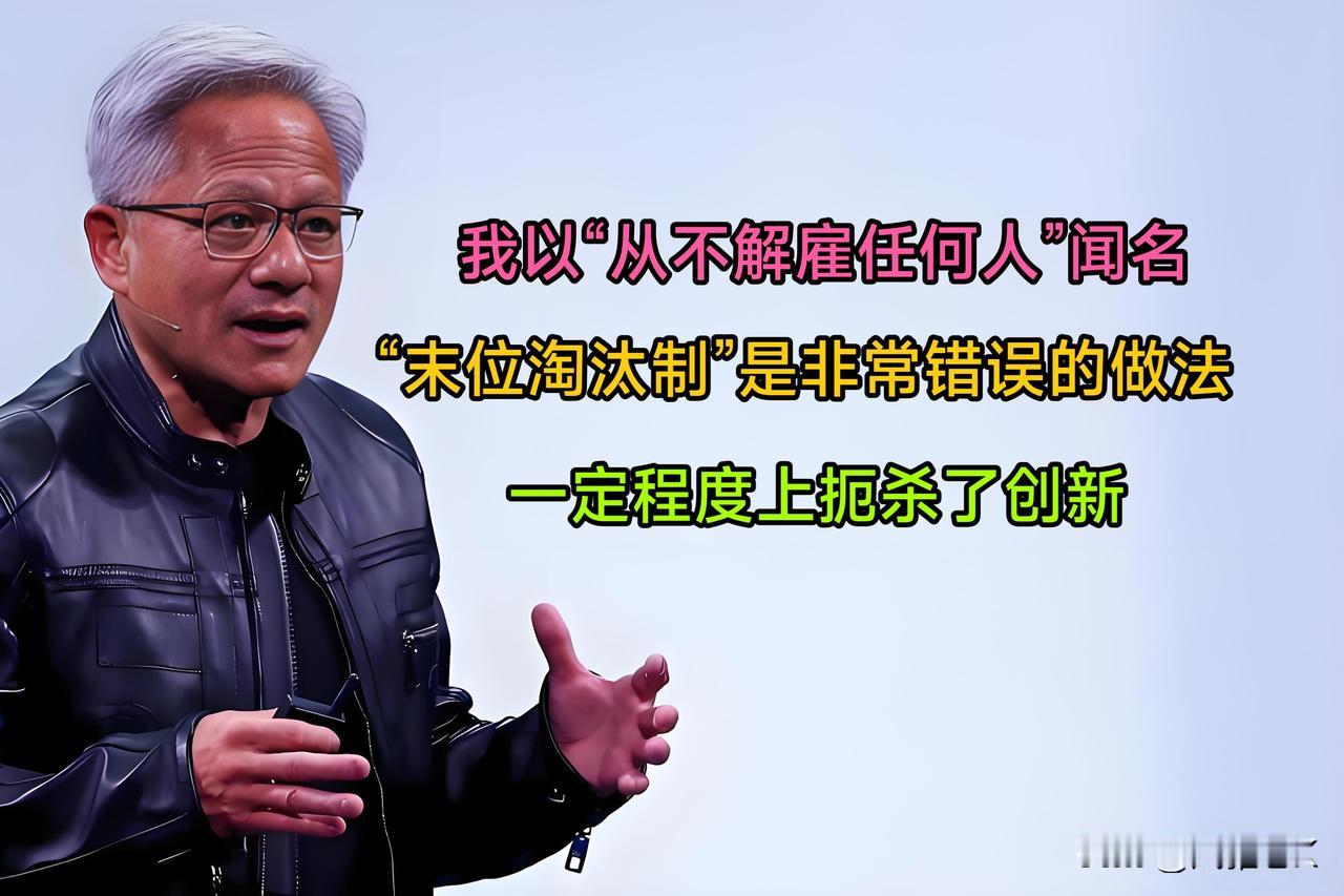 黄仁勋说“职场末位淘汰制”,他说→ 末位淘汰制是一种非常错误的做法,它打击了员工的创新,尝试创新的员工注定要承担承受失败的风险,创新本就应该经常会经历一些失败,而往往他们在吸收了失败的经验后的明天就可能为企业带来创新,甚至有可能通过创新成为拯救企业的突出人才,而你却在今天就把他们淘汰了,这是一种非常错误的做法! 👉企业需要控制运营、人力成本,节本开源,效益最大化,用最优质的人才创造最大的效益! 👉而人才需要塑造,需要不断探索,探索创新必然伴随着失败,用“末位淘汰制”就会在一定程度上让员工规避风险,扼杀创新。 这就出现了“运营成本与创新成本”的冲突,怎么破? 🔹很多公司也不乏一些摸鱼混日子的员工,或者是虽然很努力但始终未能创造出业绩,不能为公司创收类型的员工,没有了“末位淘汰制”去监督和制约,就有可能造成人力成本的浪费! 🤔这就存在了“企业制度与人力成本”的冲突,这又该怎么破? “末位淘汰制”是否适用,应该还是得看企业本身的行业性质和各部门的主要分工吧? 黄首富“末位淘汰制”的观点,你怎么看?👀