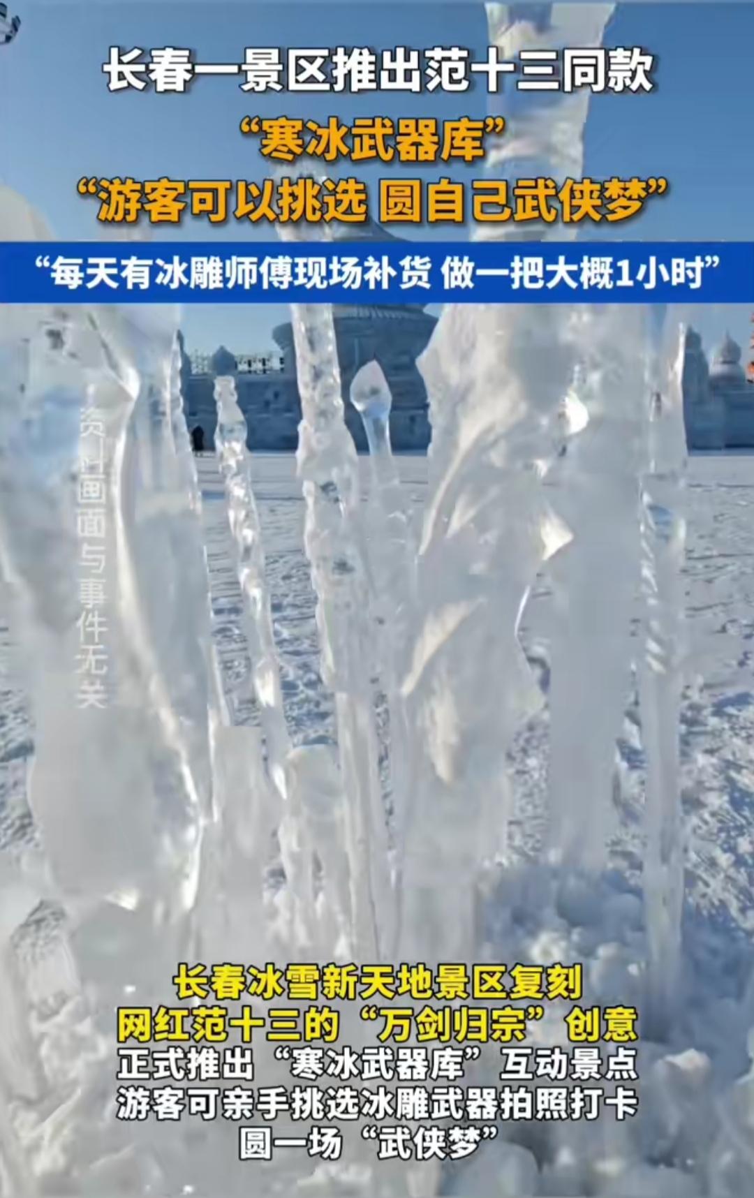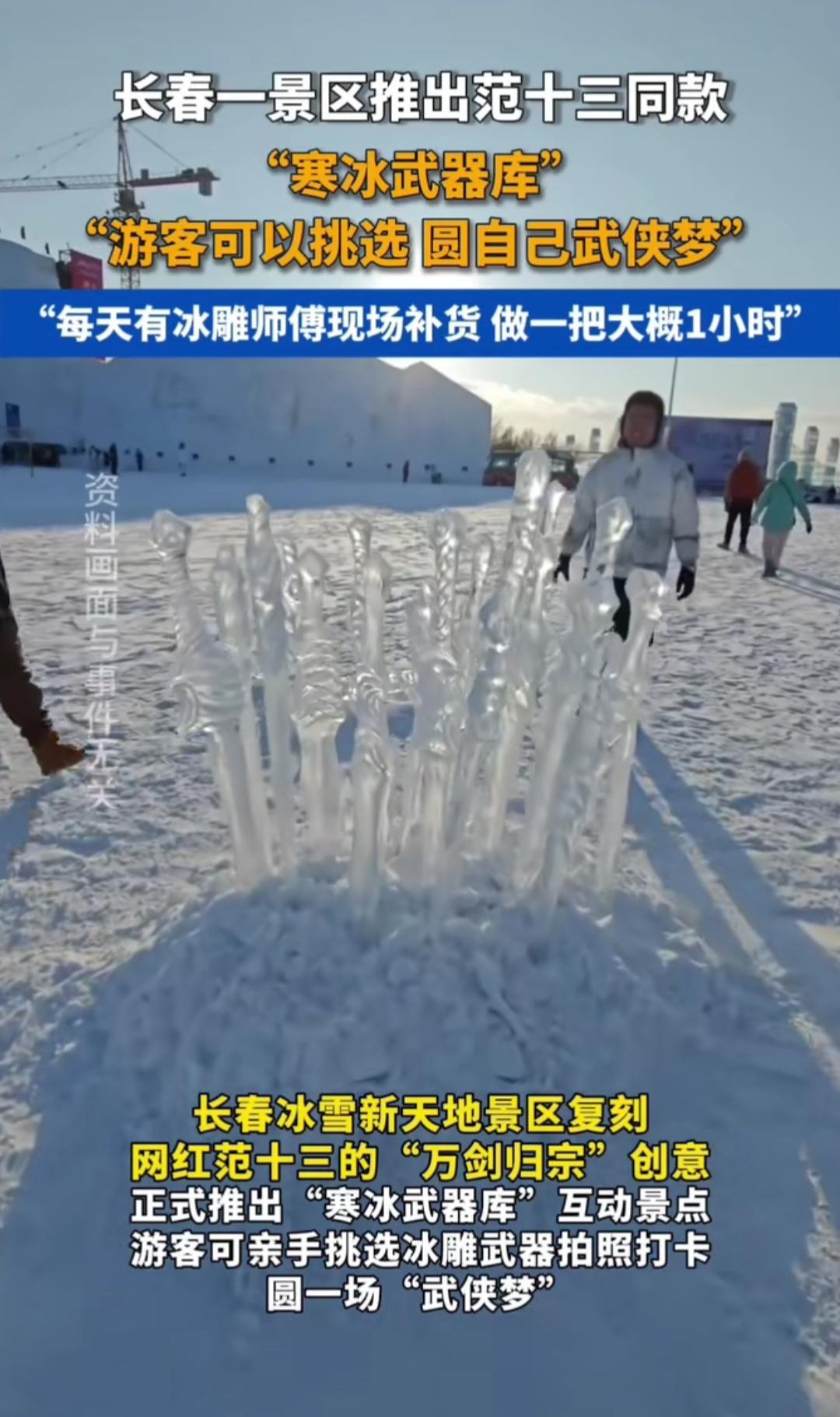 刷到长春冰雪新天地的“寒冰武器库”时,我还以为又是蹭网红热度的敷衍打卡点——毕竟太多景区跟风做同款,最后都成了“拍照5分钟排队2小时”的鸡肋。直到刷到游客举着刻了自己名字的冰剑耍帅,才发现这波是真的把流量玩明白了。 去年范十三那支“万剑归宗”的冰雕视频火遍全网,景区没只搞个复刻摆设,反而把剩下的冰剑改成了互动点:游客能DIY冰剑、匕首,刻上自己的名字,碎了还有师傅现场补雕。之前临时关闭,景区直接送免费定制冰杖赔罪,诚意拉满。 其实游客要的哪是“网红同款”?是能真真切切参与进去的快乐——握着自己名字的冰剑,在冰天雪地里当五分钟“侠客”,这才是冬天该有的热闹。把流量落地成体验,把跟风变成用心,这波长春是真的懂怎么让游客“上头”。