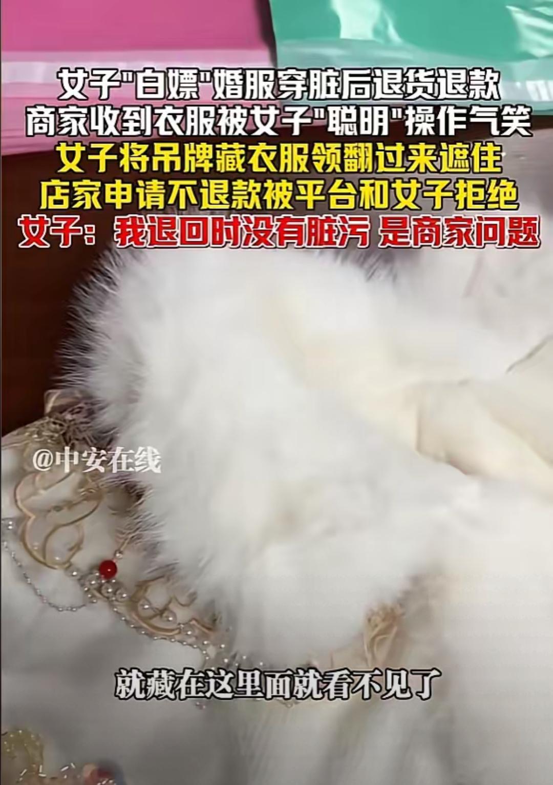 一枚别针藏住吊牌,却藏不住骨子里的贪婪!安徽女子白嫖婚服这波操作,真的又蠢又丢人! 结婚穿一次就退,还把吊牌别在毛领深处伪装全新,衣服沾了汗渍污垢直接寄回,被商家发现还倒打一耙。更气人的是平台竟因吊牌完好就站她那边,让商家吃了哑巴亏。 省钱不是这么省的,婚礼本是人生最体面的时刻,她却用这种近乎欺诈的手段,把婚姻的美好开端变成了一场闹剧。这种钻规则空子的小聪明,占的是小便宜,丢的是一辈子的人品。更可怕的是,这种行为会让商家收紧退换政策,最后所有诚信消费者都得跟着买单。 换作是你遇到这种白嫖的顾客,你会怎么维护自己的合法权益?