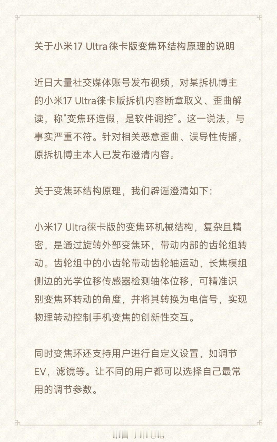 【小米公司发言人:某博主的小米 17 Ultra 徕卡版拆机内容被断章取义,其本人已发布澄清内容】小米公司发言人发布《关于小米 17 Ultra 徕卡版变焦环结构原理的说明》:近日大量社交媒体账号发布视频,对某拆机博主的小米 17 Ultra 徕卡版拆机内容断章取义、歪曲解读,称“变焦环造假,是软件调控”。这一说法,与事实严重不符。针对相关恶意歪曲、误导性传播,原拆机博主本人已发布澄清内容。关于变焦环结构原理,小米辟谣澄清如下:小米 17 Ultra 徕卡版的变焦环机械结构,复杂且精密,是通过旋转外部变焦环,带动内部的齿轮组转动。齿轮组中的小齿轮带动齿轮轴运动,长焦模组侧边的光学位移传感器检测轴体位移,可精准识别变焦环转动的角度,并将其转换为电信号,实现物理转动控制手机变焦的创新性交互。同时变焦环还支持用户进行自定义设置,如调节 EV,滤镜等。让不同的用户都可以选择自己最常用的调节参数。小米 17 Ultra 徕卡版于 2025 年 12 月 25 日发布,机身铭刻徕卡红标,售价 7999 元起。此外,官方介绍称新机配备大师变焦环,一体化精工设计,复刻相机变焦环,转动可调节焦距,去掉繁杂的操作,让摄影师专注拍摄,还可自定义调节曝光补偿、白平衡等。