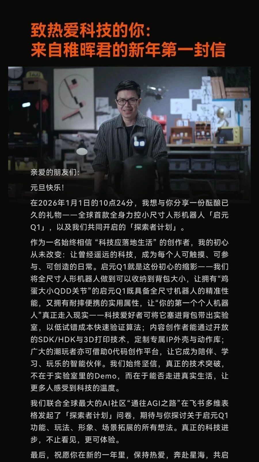 启元Q1的诞生,像推开了一扇门,让我们瞥见了“个人机器人”未来的微光。稚晖君在公开信里启动“探索者计划”,邀我们把未来造得更亮。其中,“共创点将”就是那条快速通道:仅仅20个席位,是留给那些同样相信“科技应落地生活”,并且有能力、有激情去动手的人的。 我关注智能交互陪伴,希望机器人能成为生活助手。畅想一下人机亲密交互、机器人成为家庭伙伴的未来,也太美好了!扫码填问卷,赢得加入稚晖君项目组的机会吧!