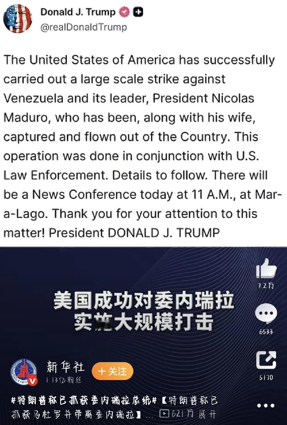 当地时间1月3日,国际政坛掀起巨震——美国总统特朗普在社交媒体突然发文,高调宣布