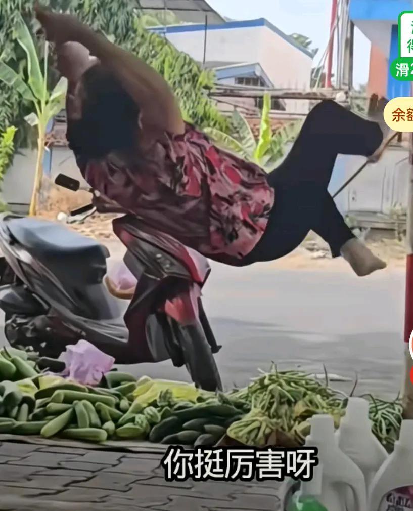一大姐在卖菜,可能是中午吧,没有人光临,然后大姐说这大中午的怪热的, 我也歇一会儿吧, 只见大姐拴着一根绳子, 自己就躺了上去, 大姐这功夫真厉害, 难道学习小龙女, 她也是古墓派传人吗? 大姐这身材看着就很担心这绳索能搁得住她吗? 但是大姐躺在上面还晃来晃去。 就这功夫,一般人还真做不到, 有人说,全凭大姐的一身肉在那平衡着。