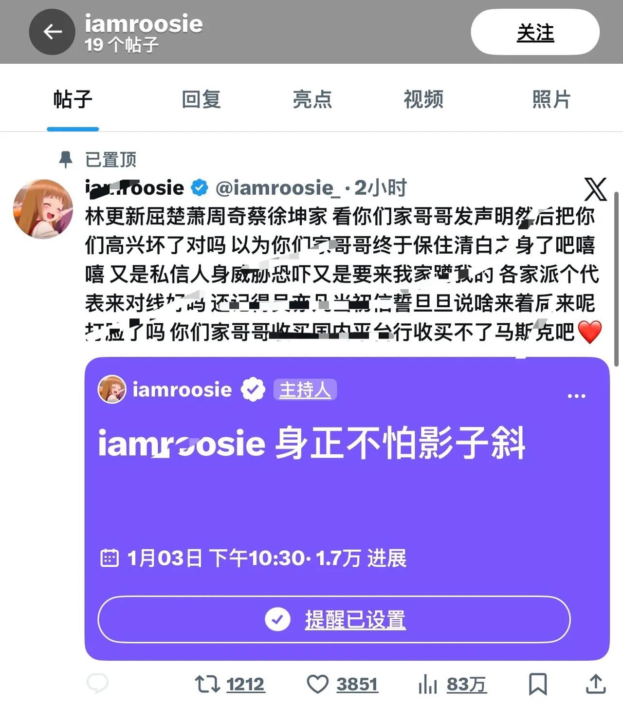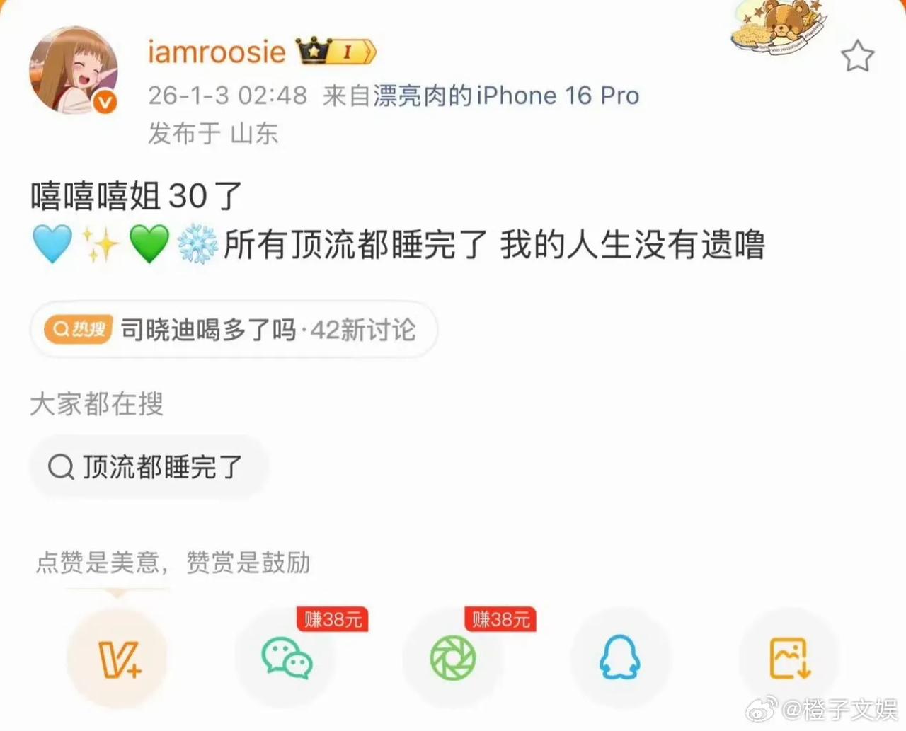 司晓迪这波操作,直接把吃瓜er的DNA都给动了! 发博自称睡遍顶流,顺手还扔了几个别人的恋情瓜,好家伙,内娱D社、国服嫂子这名号立马就挂上了,瞬间就把全网的吃瓜网友全吸引过来了。 她这瓜一放,内娱工作室直接集体炸锅。范丞丞工作室最先冲出来发声明,鹿晗工作室更猛,连发两条严正公告,关晓彤、檀健次工作室也紧跟着下场,林更新、王安宇这些人也都没闲着,齐刷刷说跟这位姐没关系,求大家别再造谣了。 这阵仗,多少年没见过了?接着神转折来了:有人电话追过去,她转头澄清说和鹿晗只是朋友,絮絮叨叨补了几句不痛不痒的料,然后就默默删博了。 整件事看下来,我就一个感觉:离谱。这姐真有那么大魅力?让半个娱乐圈的顶流纷纷倾倒?说实话,越想越觉得像是场醉酒后的独角戏,自己搭台自己演,满是梦女幻想的气息。 可偏偏,她这么一闹,真人明星们可倒了大霉,无端被卷进来,声明要发,谣要辟,粉丝要安抚,工作量哐哐往上涨。一句轻飘飘的爆料,对别人可能就是一场公关灾难。