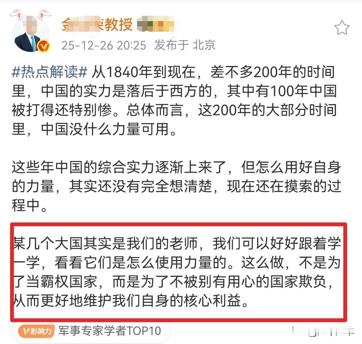 这不是暗示算是明示了吧? 就在刚才(1月3号)政委转发了一篇他25年12月26号的帖子。此帖中已经明确的说明白了,我们在一些事情中该向世界上的大国学习如何使用力量,目的不是当霸王而是更好的维护自己的核心利益。 的确如此,在46年两党曾经签署停战协议可是在同年6月,蒋就单方撕毁了协议全面内战就此爆发。49年蒋政权退守孤岛后,两党之间就再没有签订过停战协议。也就是说目前事实上我们之间还是处于战争状态,那也就是说在战争状态下是可以合法的使用一切手段维护国家安全。 现在有大国为了维护自己的利益对敌对势力的首脑,采用了斩首方法。现在就看国际社会只是谴责一下还是有其他的动作。要只是谴责我们完全可以效仿一下,以最快的速度最小的代价,完成统一大业。 统一问题是全民族的夙愿,也是大国复兴的象征。并且在国际上也不会有负面的影响。还是一句老话:机不可失,失不再来。