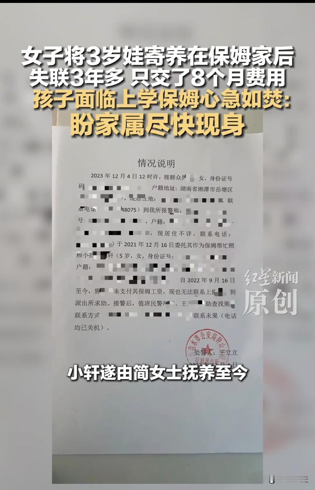 “比遗弃还绝情!”贵州六盘水,保姆简某好心照料3岁孩童小轩3年多,可孩子母亲熊某支付8个月费用后,竟失联整整3年多!如今小轩已7岁,到了上学年纪却因身世成谜、缺监护人签字无法报名,简某既不知道孩子生父是谁,连孩子外婆都直言“不清楚这孩子来历,管不了”,急得整夜难眠:“我把她当小宝贝养了这么久,总不能让她耽误学业吧!” 当地未成年人保护中心曾介入协调,却因简某一度犹豫不了了之,如今她走投无路,只盼熊某能现身给孩子一个合法身份! 熊某将3岁的孩子小轩寄养在简某家中后,失联长达3年多,仅支付了8个月的照顾费用。 如今小轩已7岁,面临入学难题,简某心急如焚,盼孩子家属尽快现身解决问题。 简某在当地从事家政工作多年,为人勤恳负责。 2021年12月,熊某带着3岁的小轩找到她,说自己有急事要处理,暂时没法照顾孩子,希望简某能帮忙照料,还承诺会按时支付费用。 看着小轩怯生生攥着熊某衣角的模样,简某心里软了:这孩子看着就可怜,帮人帮到底吧,顶多就是多双碗筷的事,便一口答应了下来。 起初8个月,熊某每月按时转来3000元照顾费,偶尔还会发消息问小轩的近况,简某也会拍些孩子的日常照片发过去,心里想着这位妈妈看着还是挺上心的,只是暂时遇到难处了。 可从2022年9月起,熊某的消息越来越少,电话也常无人接听,最后干脆彻底失联——微信不回、电话关机,简某心里咯噔一下:不会是想把孩子扔给我吧?可这小孩子才这么小,我总不能不管。 这3年多里,简某把小轩当成亲孙女一样照顾。教她说话、陪她学走路,夜里孩子发烧时守在床边彻夜不眠,周末带着孩子去公园玩,看着小轩从懵懂幼童长成活泼的小姑娘,简某的心里又暖又慌。 孩子越乖,我越心疼,可她不是我的孩子,总有一天要回到自己家人身边,而且她马上要上学了,没手续可怎么办。 更让她不安的是,相处这么久,她从没听熊某提过孩子的父亲,也不知道小轩的户口、籍贯在哪,这孩子的来历就像个谜。 官方信息显示,小轩户籍在贵州清镇市,与母亲熊某户籍地一致,户口登记的监护人是贺某某,但贺某某称“只是好心帮忙落户,并非孩子生父”,这也让小轩的身世更加扑朔迷离,我连帮她办入学的头绪都没有。 为了找到熊某,简某四处打听,辗转联系上了小轩的外婆,可对方要么拒接电话,要么冷冷地说“这个孩子是谁的孩子,我也不知道”“我和熊某已决裂、断联,她死活都不清楚”。 简某对着电话听筒红了眼:就算不管女儿,难道连这个孩子也不管了吗? 走投无路的她曾在2023年12月向派出所报案求助,民警查询到熊某联系方式但联系未果,之后联动了未成年人保护中心。 看着工作人员记录情况时,她心里默念一定要找到熊某,哪怕只为了孩子能顺利上学。 如今小轩每天都会拉着简某的手问:“简奶奶,妈妈什么时候来接我呀?我想上学和小朋友一起玩。”每次听到这话,简某都强忍泪水哄着小宝贝,转过身却忍不住叹气。 我能照顾她的人,却给不了她一个合法的身份,这学上不了,孩子的未来不就耽误了吗? 而另一边,失联的熊某或许也藏着复杂的心思:当初只是想找个人临时照看孩子,没想到自己的事越缠越乱,根本没法回头; 也可能是面对生活的窘迫,干脆选择逃避:反正简某人好,会照顾好小轩,我就算出现,也拿不出钱,也解决不了问题,不如就这样躲着; 甚至或许她也有难言之隐,只是既没勇气面对简某,也没能力承担抚养小轩的责任,只能用失联的方式逃避一切。 截至目前,当地政府已介入协调,尝试通过多种渠道寻找熊某,同时对接教育、民政部门探讨小轩的入学方案,但熊某仍未现身,事件仍在进一步处理中。 一、熊某拖欠费用并失联,已构成违约 《民法典》第五百七十七条 当事人一方不履行合同义务或者履行合同义务不符合约定的,应当承担继续履行、采取补救措施或者赔偿损失等违约责任。 熊某与简某形成合法的照顾服务合同关系,其未按约定支付费用且长期失联,需承担支付拖欠费用、赔偿简某额外抚养支出的责任。 二、熊某需履行监护人法定职责 《民法典》第二十七条 父母是未成年子女的监护人。监护人应当按照最有利于被监护人的原则履行监护职责,保护被监护人的人身权利、财产权利以及其他合法权益等。 熊某作为小轩的法定监护人,不得以失联逃避监护义务,必须配合办理孩子入学手续;若其持续拒不履行,简某可向法院申请指定临时监护人,保障小轩的受教育权。 此外,若小轩经核查认定为“事实无人抚养儿童”,可向清镇市民政部门申请基本生活费、教育资助等福利,缓解入学及生活压力。 对于此事,大家如何看?素材来源于红星新闻2026.1.1报道。