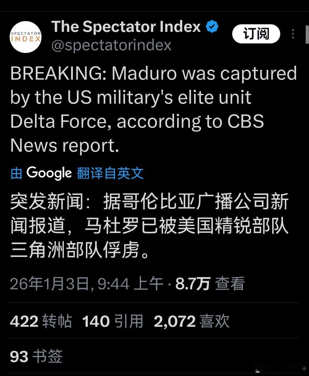 突发新闻:据哥伦比亚广播公司新闻报道,马杜罗已被美国精锐部队三角洲部队俘虏。