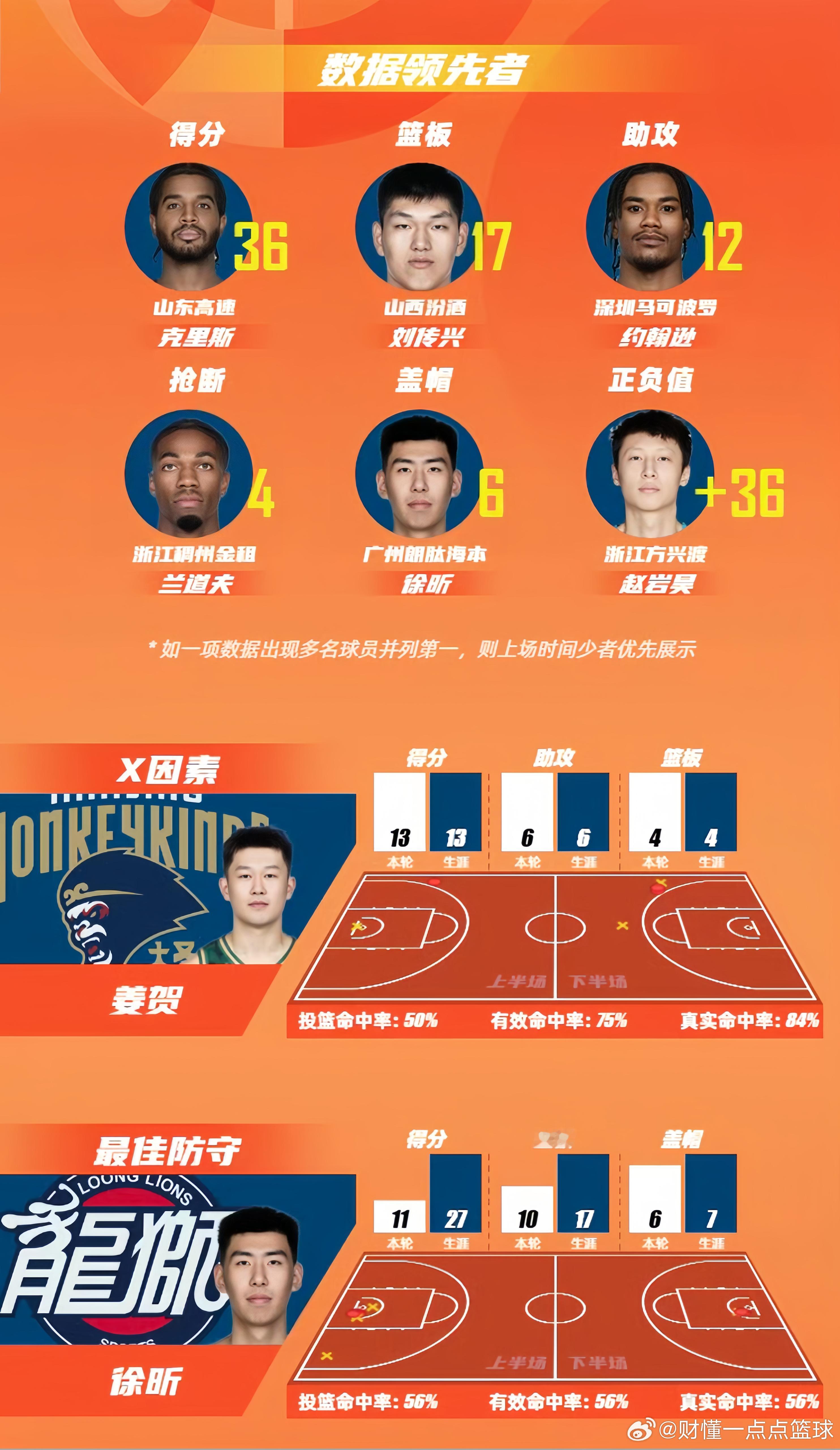恭喜徐昕,当选CBA常规赛第9轮的最佳防守球员!徐昕新赛季加盟广州男篮后,上场时间和得分就各方面数据都得到了全方面的提升,并在广州男篮爆冷昨天击败山西男篮的比赛中拿下11分10板6盖帽的全面数据。看来徐昕越来越涨球了!恭喜恭喜!