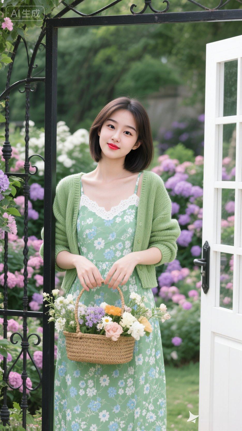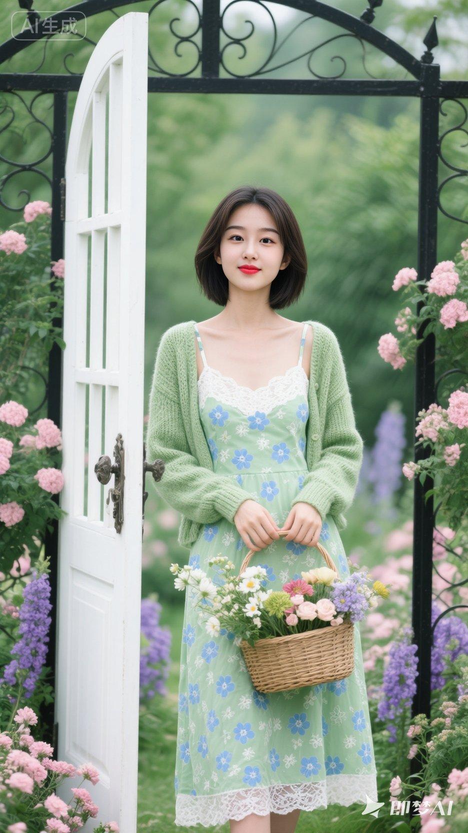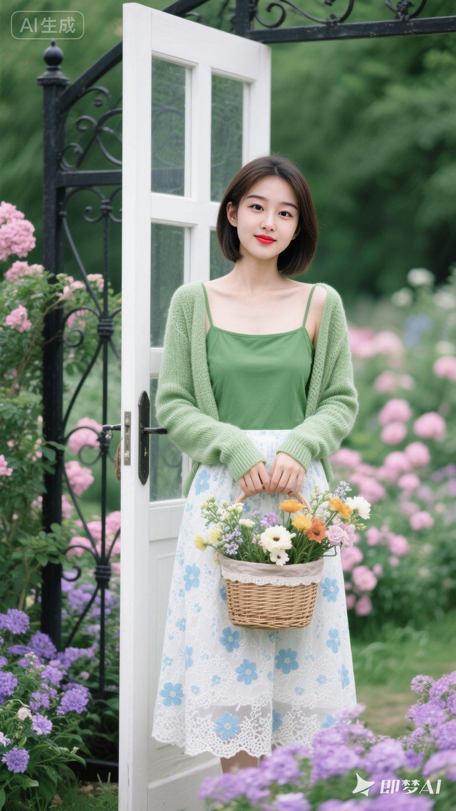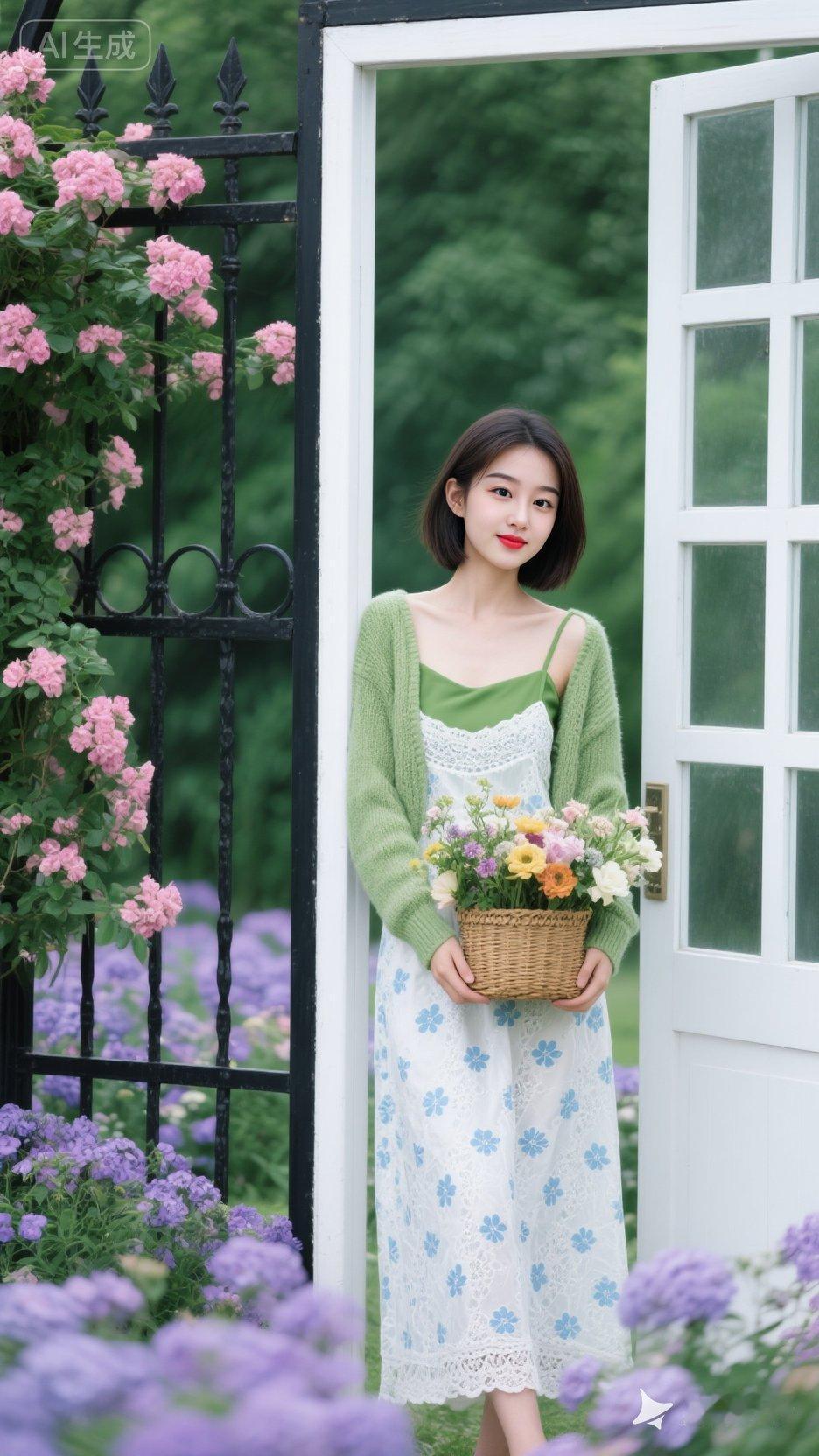 春日花园里的少女,手捧鲜花,清新自然。