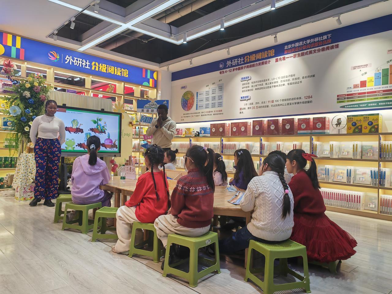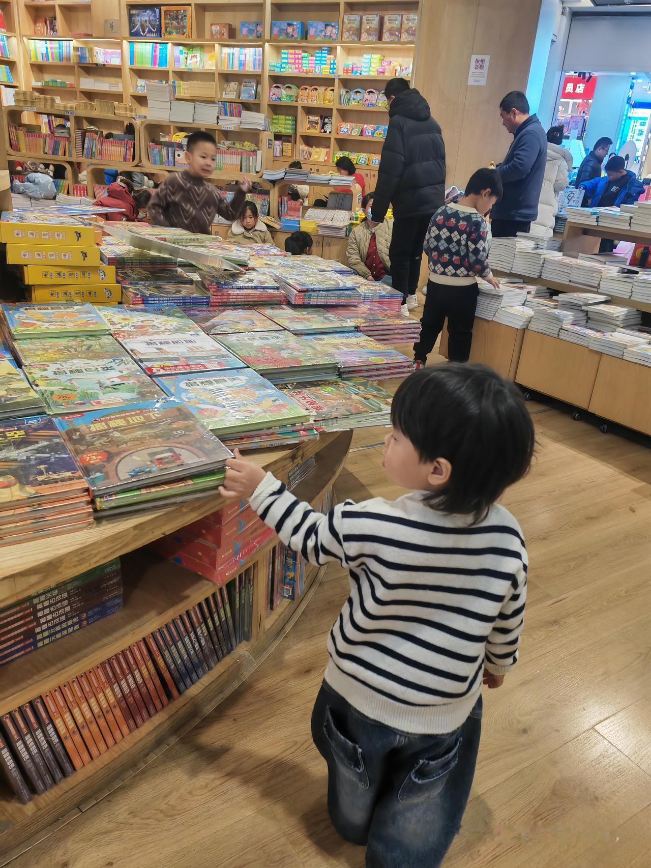 记不清有多少年不去新华书店了,感觉是很久很久以前的事儿了。以前是为了儿子去买书、看书,如今是为了儿子的儿子。 大孙子马上就三岁了,从一岁多开始给他网购了各种各样的书,可是这孩子貌似对书本一点也不感兴趣,为此我很犯愁,身边有好几个同事、朋友家和他差不多大的孩子都开始识字了,这可怎么办呢? 有人建议我多带宝宝去书店感受一下那里的读书氛围。趁着元旦假期,我立刻行动起来了,这不,昨天去了一趟,今天接着又去了一趟。 出乎我的意料,今天的书店和以前的大不一样了,紧跟时代潮流,与时俱进的新华书店太令我惊讶了。 以前的新华书店仅仅是个买书、看书的地方,如今的新华书店成了一个休闲、娱乐、购物的综合体,更是儿童的乐园。各种孩子的学习用品,书籍,儿童的玩具,应有尽有。如果你饿了,渴了,累了,不用担心,五楼有好吃的,好喝的,还有舒服的沙发等你去享受呢!太惬意了。 更有甚者,还有聘请的外教在现场授课呢!家长和孩子在共同学习英语,这一招太厉害了,为了孩子的英语,家长们也是拼了。