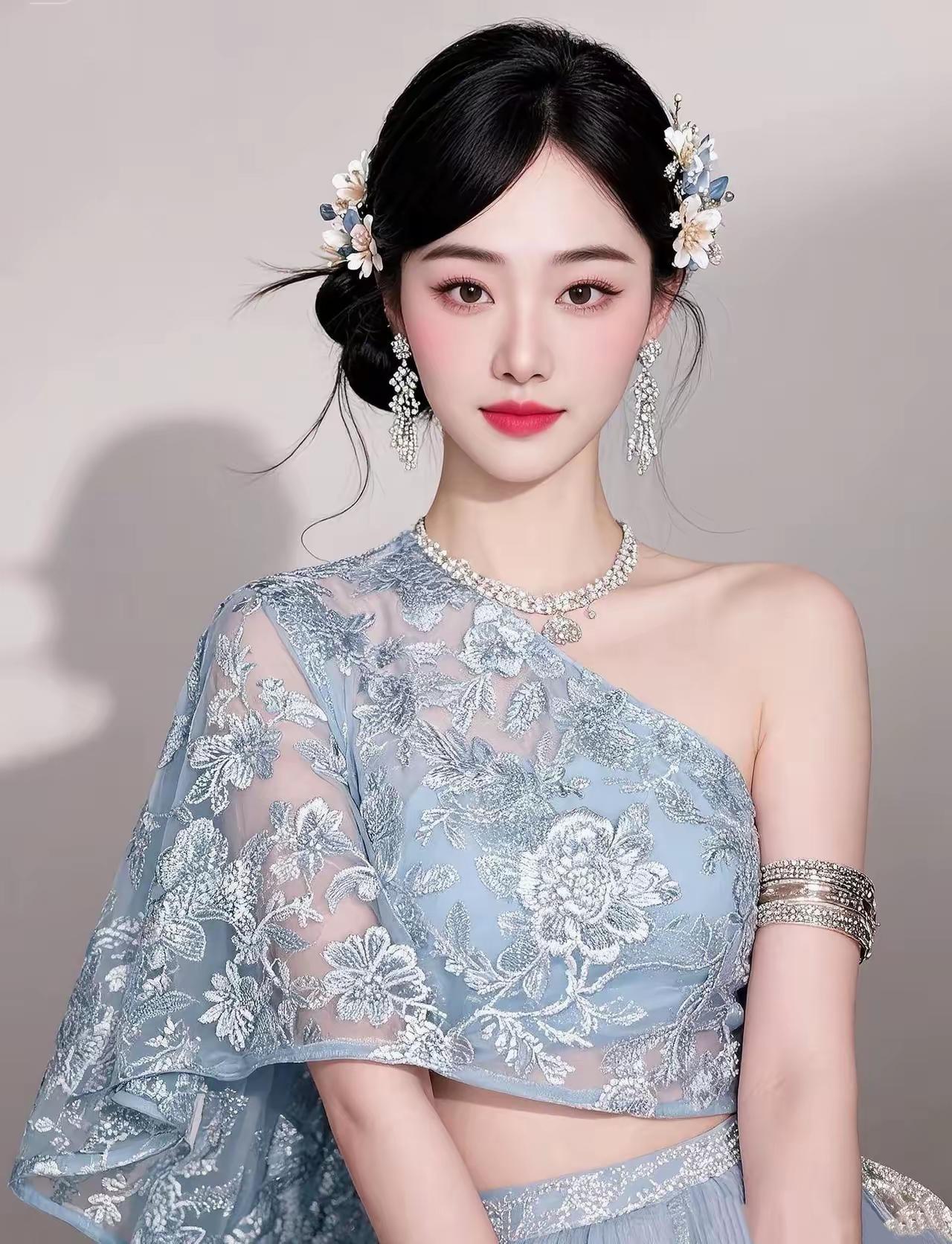 香槟缎影裹柔肩,红唇一抹胜春光红唇美人照红唇礼服