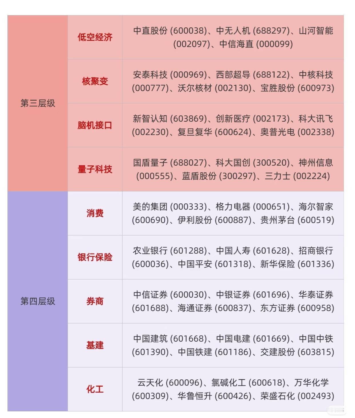 2026年A股产业层级全景图将市场产业划分为多个层级,其中: - 第一层级涵盖五大核心产业: - AI算力:包括中科曙光、寒武纪、中际旭创、新易盛、浪潮信息等。 - 人形机器人:包括五洲新春、卧龙电驱、三花智控、拓普集团、绿的谐波等。 - 半导体:包括中芯国际、韦尔股份、北方华创、澜起科技、长电科技等。 - 创新药:包括恒瑞医药、百济神州、信达生物、君实生物、翰森制药等。 - 储能:包括宁德时代、先导智能、比亚迪、亿纬锂能、阳光电源等。 - 第二层级包含四大基础及能源相关产业: - 有色金属:包括洛阳钼业、紫金矿业、赣锋锂业、华友钴业、天齐锂业等。 - 光伏:包括隆基绿能、通威股份、晶澳科技、横店东磁、福莱特等。 - 电力设备:包括中国西电、特变电工、国电南瑞、正泰电器、许继电气等。 - 稀土:包括北方稀土、中国稀土、盛和资源、五矿稀土、广晟有色等。 - 第三层级聚焦前沿科技与新兴产业: - 低空经济:包括中直股份、中无人机、山河智能、中信海直等。 - 核聚变:包括安泰科技、西部超导、中核科技、沃尔核材、宝胜股份等。 - 脑机接口:包括新智认知、创新医疗、科大讯飞、复旦复华、奥普光电等。 - 量子科技:包括国盾量子、科大国创、神州信息、蓝盾股份、三力士等。 - 第四层级覆盖传统与防御性行业: - 消费:包括美的集团、格力电器、海尔智家、伊利股份、贵州茅台等。 - 银行保险:包括农业银行、中国人寿、招商银行、中国平安、新华保险等。 - 券商:包括中信证券、中银证券、华泰证券、海通证券、东方证券等。 - 基建:包括中国建筑、中国电建、中国中铁、中国铁建、交建股份等。 - 化工:包括云天化、氯碱化工、万华化学、华鲁恒升、荣盛石化等。 整体来看,该全景图从高端科技、先进制造,到资源能源、传统行业,形成了多层次、全覆盖的A股产业分布结构。