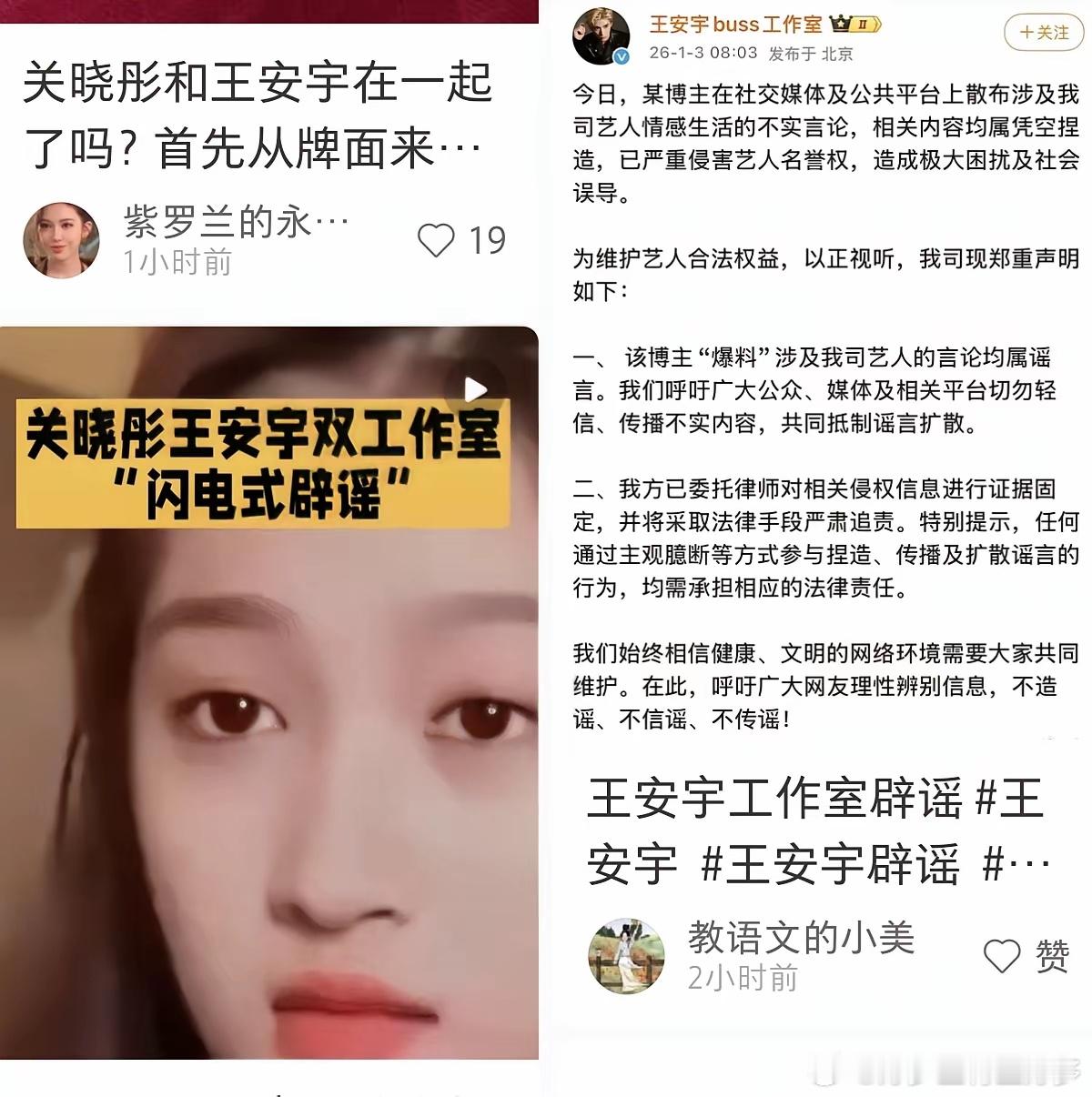 娱乐圈的假瓜来得快去得更快,不信你看关晓彤王安宇,澄清速度比谣言扩散还利落。1月2号深夜有人在粉丝群说两人谈恋爱,没图没视频全靠嘴,结果第二天早上八点王安宇工作室先发声明,说内容都是编的,证据都固定好了要追责;关晓彤工作室也跟着否认,说就同事关系,两家动作同步得跟约好了似的。那爆料人还说自己睡遍顶流,点名好几个男星,这种话一听就没谱,要真有恋情能连张牵手照都没有?两家工作室火速反击,也是怕谣言越传越歪,伤了艺人名誉。现在造谣成本这么低,随便一句话就能上热搜,工作室不硬气点,下次谁还敢信真话?