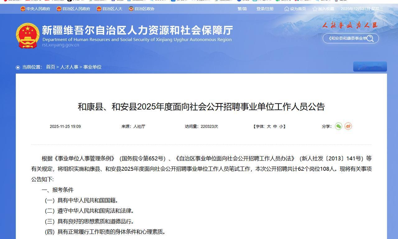 现在考公竞争激烈到什么程度?新疆和田地区去年刚成立了两个县,分别叫和安县、和康县,最近招收108名事业单位工作人员,因为对学历要求较低,只要高中及以上就能报,部分岗位中专、技校、职高毕业生也可报考,居然吸引了18000多人完成缴费报名,而且考生来自全国各地。 要知道,这两个县可不是什么繁华都市的“铁饭碗”,而是实打实的边疆基层岗。之所以能引发这么疯狂的争抢,原因很简单:门槛低。 招录条件里写得清清楚楚,学历要求高中及以上就能报,部分岗位中专、技校、职高毕业生也可报考。 在如今“卷”到飞起的就业市场上,这几个字就像是一块巨大的磁铁,瞬间吸走了无数急于上岸的年轻人的目光。 不管你是东北的、江南的,还是中原腹地的,只要符合条件,大家都一窝蜂地往这儿挤。 18903人去抢一百多个位置,这比例放在任何考场都足够吓人。 但由于大家都在网上操作,很多人在点下“报名”键的那一刻,其实根本没概念自己要去的是个什么样的地方。大家心里只有一个念头:先考上再说,有了编制,这辈子就稳了。 可和安县与和康县,那是真正的喀喇昆仑山脉高原深处。对于从小生活在内地的年轻人来说,这里的生活挑战是全方位的。 最简单的网购,虽不如内地便捷,但两县政府驻地已有基础快递服务,包裹从地区首府中转至县里,一般需要3-5天左右。 平时在老家,快递三两天就到,在这儿,等拿到手,最长也不会超过一周。 至于手机信号,在主要区域可保障基本使用,部分偏远地带可能存在信号不稳定的情况,想刷个短视频偶尔需要举着手机找信号。 而且这里是少数民族聚居区,语言环境、饮食习惯、风俗人情,跟内地完全是两个世界。 一个初来乍到的外地人,想在这里开展工作,光是听懂老乡说话这一关就得卡住好久。那种举目无亲、语言不通的孤独感,比环境的艰苦更熬人。 即便如此,那一万八千多名考生还是义无反顾地报了名,这说明现在考公大军十分焦虑。 很多人其实心里也清楚这地方苦,但为了那个“公家人”的身份,为了那份旱涝保收的工资,宁愿赌一把。 这就导致了一个很尴尬的现象:考的时候千军万马,等到真考上了、报到了,可能会出现适应困难的情况。 所以现在很多人都在讨论,像这种特殊的边疆县城,招聘是不是该换个思路?虽然面向全国招聘,也鼓励本地考生报考,但报名数据好看却留不住人是硬伤。 反倒是本地的考生,他们生在这、长在这,适应这里的气候,听得懂这里的方言,家就在这儿,心也就定得下来。 优先招录本地人,哪怕学历门槛再灵活一点,起码能保证队伍的稳定,工作也能立马上手。 还有一些人认为既然要建设新县城,与其招那些大概率会出现适应困难的大学毕业生,不如直接从内地的行政事业单位里,抽调一批有经验的党员干部过来支援。 这些人有觉悟、有能力,更重要的是有工作经验,来了就能顶得住压力,干得了实事。毕竟大西北的建设不是靠一时的考试热情就能撑起来的,它需要的是真正能扎下根、吃得起苦的脊梁。 你会觉得边疆招聘是该坚持面向全国“掐尖”,还是该优先考虑本地人的稳定性,又或者是另辟蹊径寻找支援?欢迎到评论区讨论 本文首发于今日头条 信息来源:新疆维吾尔自治区人力资源和社会保障厅