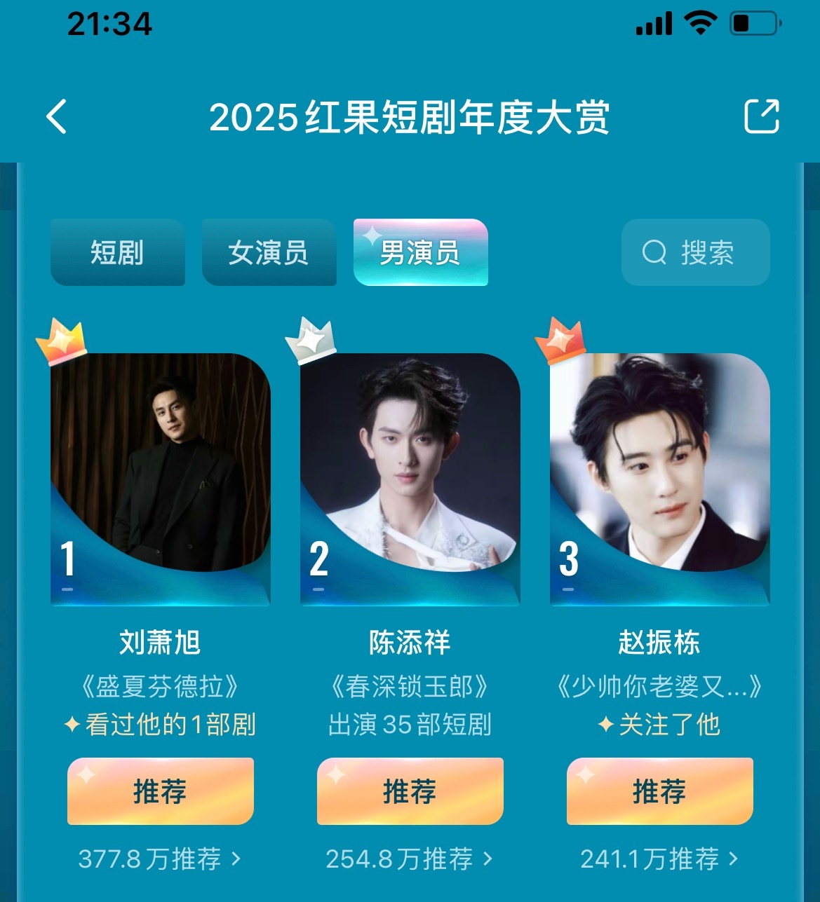 红果年度演员明天是最后一天目前女演员前三甲:郭宇欣、王格格、岳雨婷男演员前三甲:刘萧旭、陈添祥、赵振栋一起期待“短国民选年度前三”的诞生