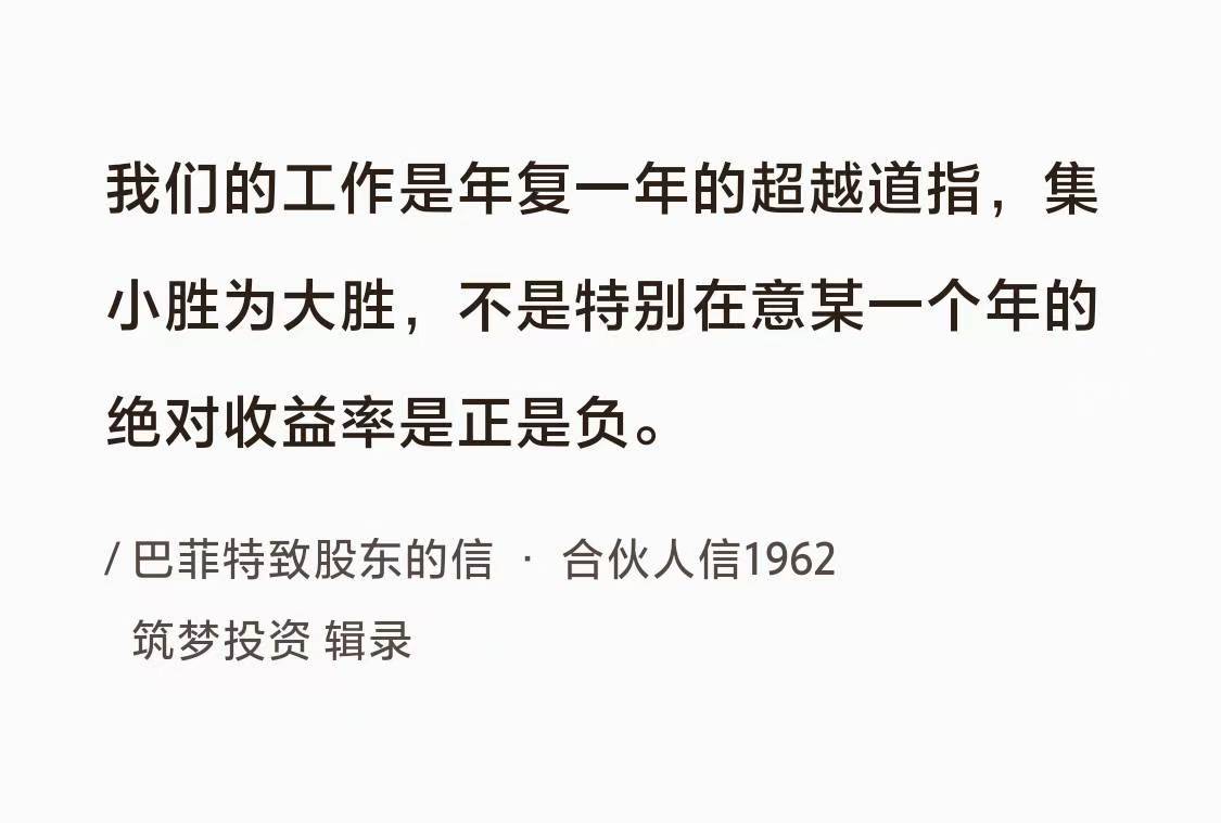 巴菲特曰:“我们的工作是年复一年的超越道指,集小胜为大胜,不是特别在意某一个年的绝对收益率是正是负。”