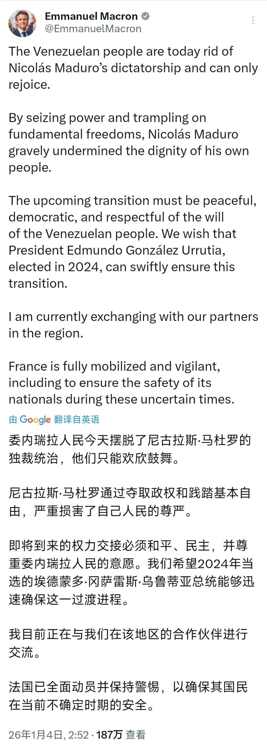 全世界都知道,美国人不是为了“解放”委内瑞拉,而是为了掠夺委内瑞拉石油,马克龙以为美国人不会抢夺他们吗?阿尔斯通的事情忘记了吗?!美国人的下一个抢夺目标已经很清楚,那就是欧洲的丹麦的格陵兰岛,马克龙是不是觉得美国人做的好?!