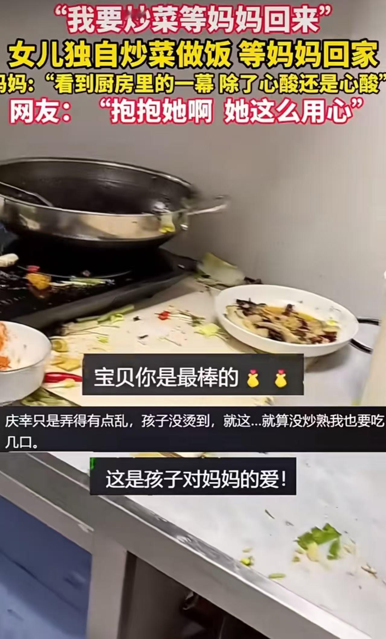 看哭全网!福建,女子下班回家,看到6岁的女儿为了给她做饭,把厨房弄得一片狼藉,她又感动又心酸,对女儿说:“以后不要给妈妈做了……”孩子听到妈妈这样说,以为妈妈生气了,解释说:“我想要炒好菜,等妈妈回来就能吃饭…… 傍晚,奔波了一天的女子推开家门,一股混杂着油烟和饭菜的味道扑面而来,随之映入眼帘的厨房场景,让她瞬间红了眼眶。 台面洒满了面粉,地上躺着散落的青菜叶,两个倒扣的调料瓶旁,半碗炒得发黑的鸡蛋静静放着,6岁的女儿正踮着脚,用沾着油污的小手试图擦拭灶台。 疲惫感在看到女儿的那一刻烟消云散,取而代之的是涌上心头的感动与心疼。 女子走上前轻轻抱住女儿,声音带着难以察觉的哽咽,告知孩子以后不必再做这样的事。 这句话却让原本带着期待的小女孩瞬间紧绷了身体,小手紧紧攥着衣角,眼神里满是不安,生怕自己的举动惹了妈妈不快。 孩子努力想把事情说清楚,那份单纯的心意里,藏着对妈妈早出晚归的心疼,只想用一顿自己亲手做的饭,让妈妈回家就能感受到温暖。 这段记录日常的视频被女子发布到网络后,很快引发全网共鸣,相关话题迅速登上热搜。 无数网友被小女孩的懂事戳中泪点,纷纷留言分享自己的感受。 有人想起了自己童年时想为父母分担却弄巧成拙的经历,有人感慨现在的孩子大多被精心呵护,这样主动体谅父母的举动更显珍贵。 更有不少身为父母的网友感同身受,明白这份感动背后,藏着多少为人父母的不易,也藏着孩子对家庭最纯粹的爱。 这则温暖的小事,看似是普通家庭的日常片段,却折射出当下家庭中劳动教育与情感培养的深层内涵。 这个6岁的小女孩,或许并不清楚什么是劳动教育,却在潜移默化中理解了劳动的意义——用自己的行动为家人付出。 在城市化进程不断加快的当下,双职工家庭占比持续攀升,很多家庭面临着陪伴时间不足的困境。 小女孩之所以会主动做饭,或许正是因为平日里看多了妈妈的忙碌与疲惫。 值得注意的是,对家长而言,面对孩子这样略显笨拙的付出,如何回应至关重要。 孩子的劳动参与感远比结果更重要,过度追求完美只会挫伤他们的积极性。事件中的女子,感动与心疼交织的情绪,以及后续对孩子心意的肯定,正是恰当的引导方式。 这种回应能让孩子明白,自己的付出被看见、被珍惜,从而更愿意主动承担家庭责任,在劳动中收获成长。 这则温暖的故事之所以能看哭全网,本质上是因为它触碰了人们内心最柔软的角落——那份不掺杂质的亲情与付出。 我们常常被工作和琐事裹挟,却忽略了孩子用自己的方式表达的爱意。 这个6岁的小女孩用一顿“糟糕”的饭菜告诉我们,最好的成长从来不是单向的呵护,而是双向的理解与付出。 家庭中的劳动教育,从来都不只是让孩子学会做家务,更是让他们在实践中懂得责任、学会感恩,这才是成长路上最宝贵的财富。 这份来自孩子的温暖,也让我们重新审视亲子相处的模式。你是否也曾忽略过孩子主动分担的心意?